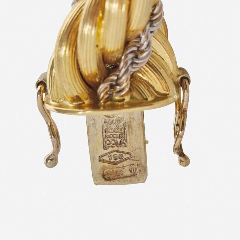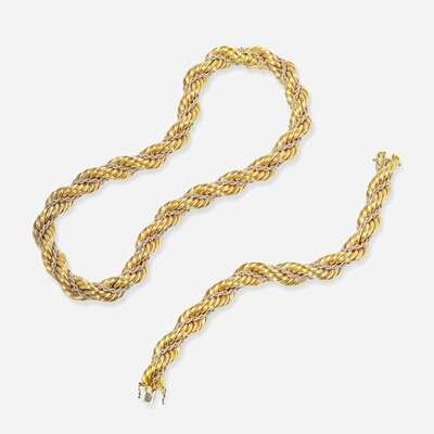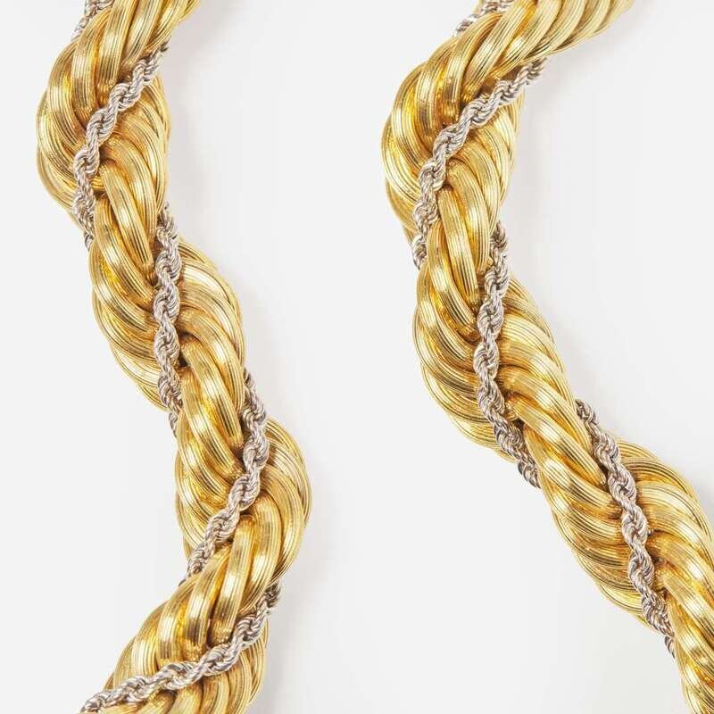A matching bracelet and necklace by Nicolis Cola, crafted from 18K yellow gold twisted rope chain, intertwined with twisted 18K white gold rope chain. The pieces can be worn separately as necklace and bracelet, or can be clasped together to form a longer necklace.
