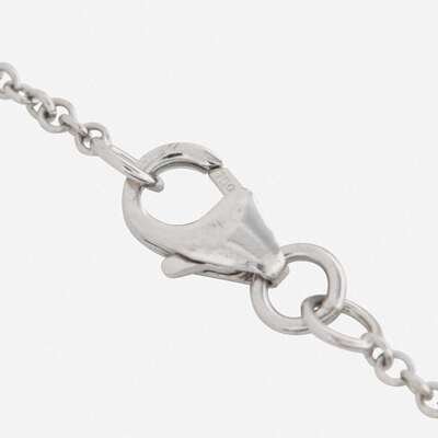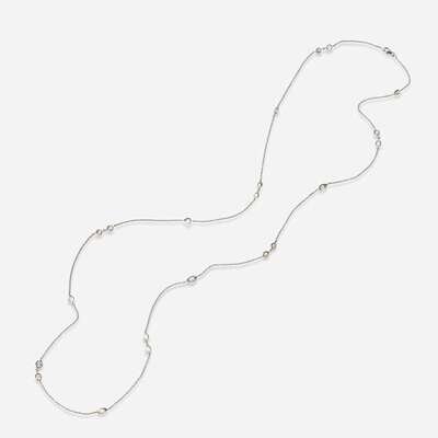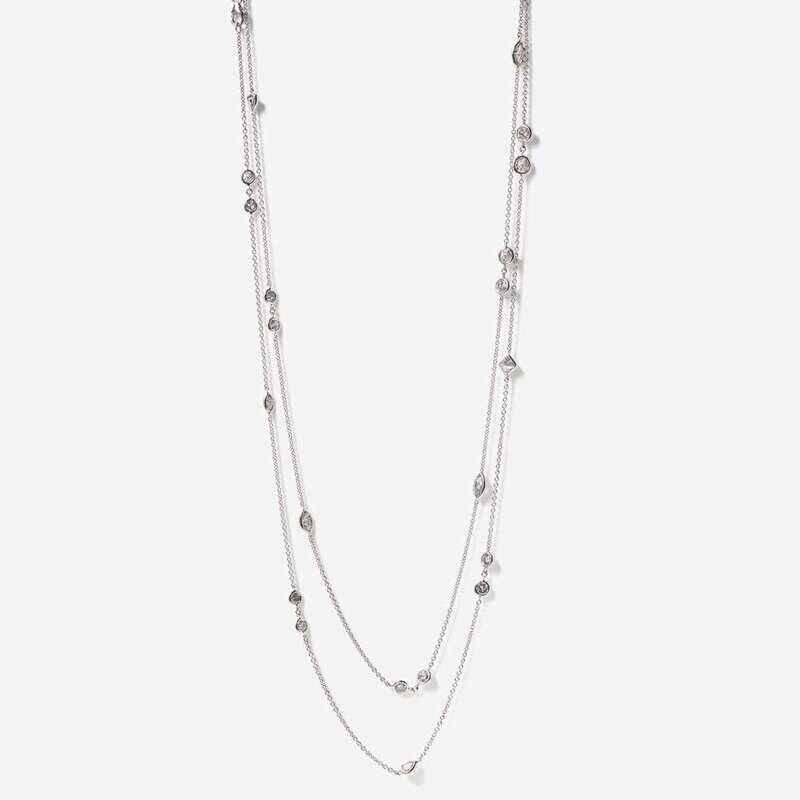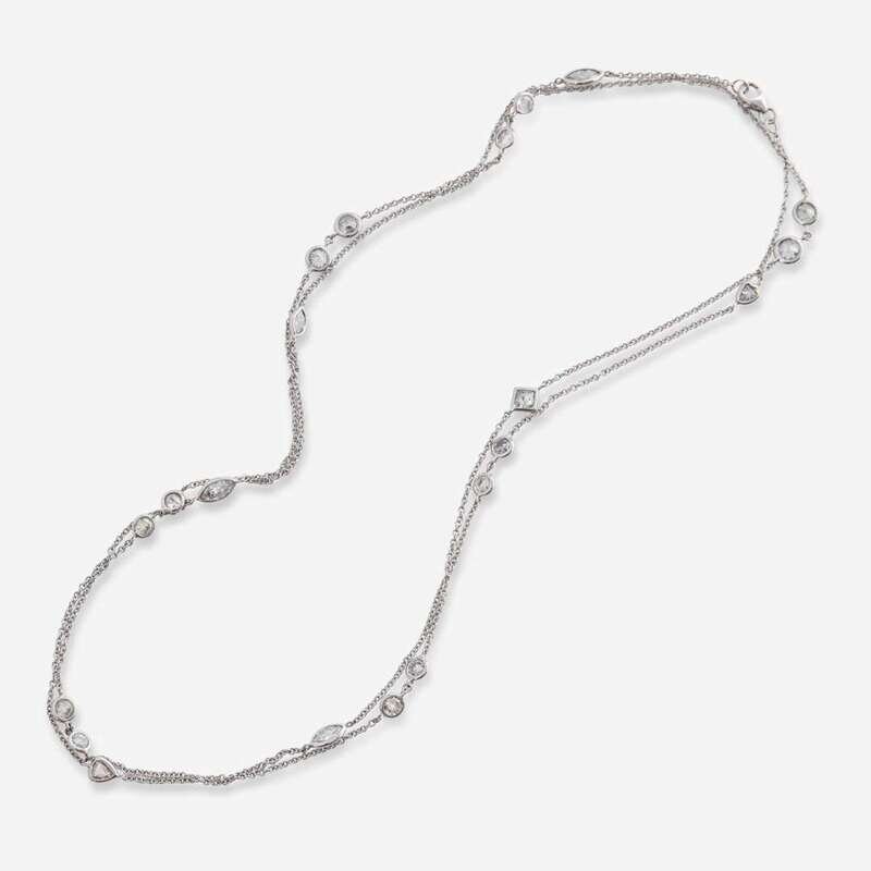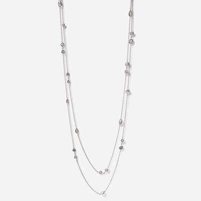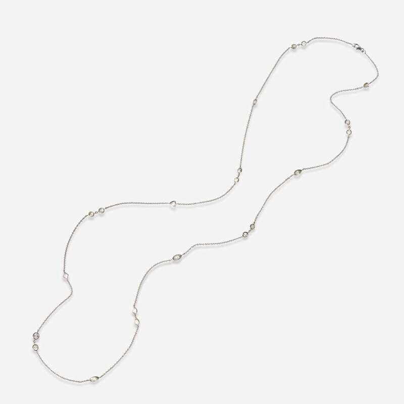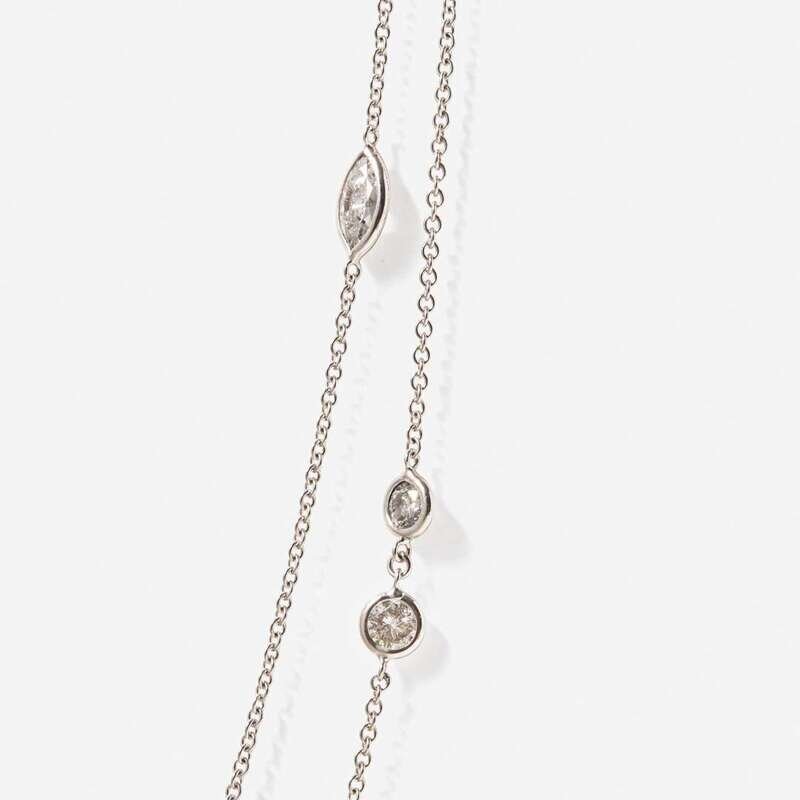 An 18K white gold station necklace, set with round brilliant-cut, marquise-cut, and princess-cut diamonds. Diamonds have faint color (K - M), with I clarity. Total estimated weight of diamonds: 7.95 carats.