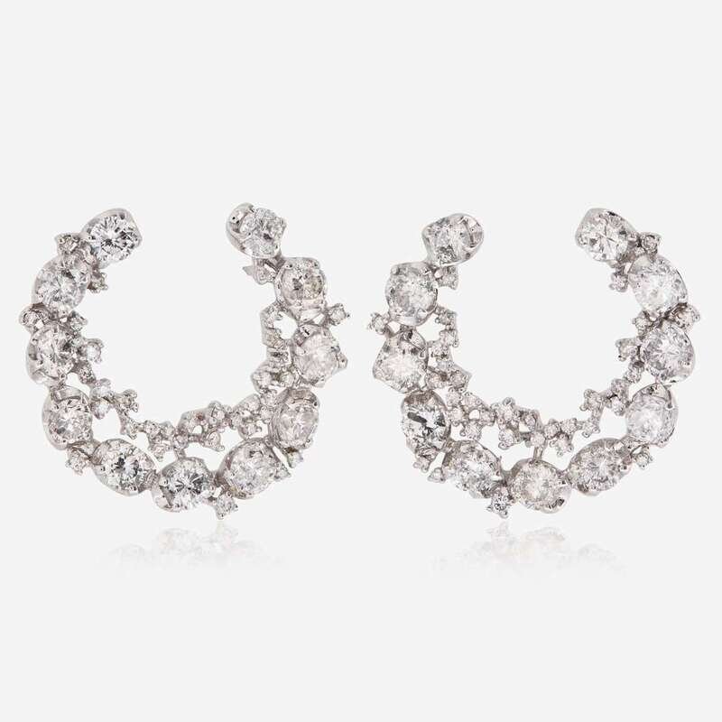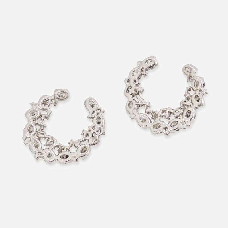 A pair of 18K white gold earrings, suitable for pierced ears on stud posts with butterfly push-backs, set with variously-sized round brilliant-cut diamonds in a crescent shape. Diamonds are near colorless to faint color (J - M), with SI - I clarity. Total estimated weight of diamonds: 6.70 carats.