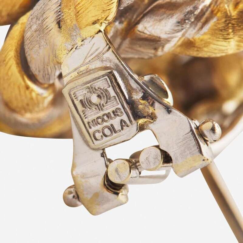 A pair of two-tone 18K yellow and white gold Italian earrings by Nicolis Cola, designed as double knots of alternating textured twists of white and yellow gold. Suitable for pierced ears on stud posts with omega clip backs.