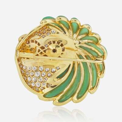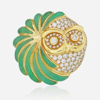 An 18K Yellow Gold, Green Onyx, and Diamond Owl Brooch French