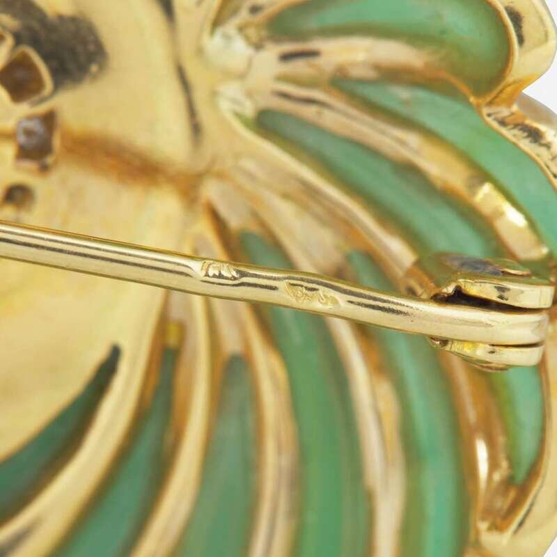 An 18K yellow gold brooch with French hallmarks designed as an owl, set with carved green onyx feathers and round brilliant-cut diamonds on the eyes and body. Diamonds are near colorless (G - J), with SI - I clarity. Total estimated weight of diamonds: 2.00 carats.