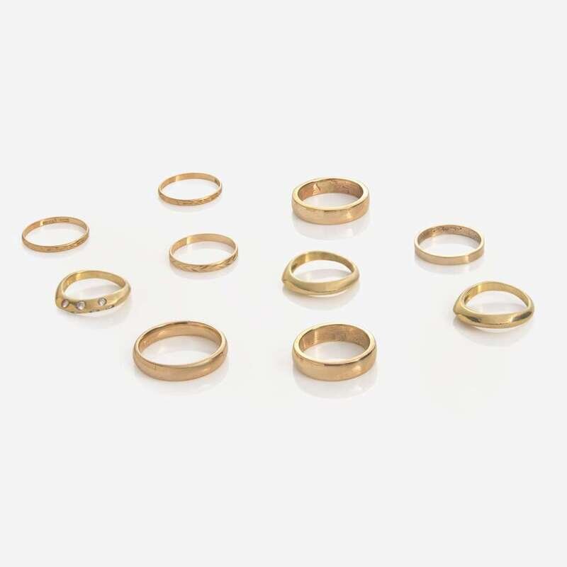 A collection of ten contemporary yellow gold rings, including five 14K yellow bands, four 18K yellow gold bands, and one 18K yellow gold ring set with seven round brilliant-cut diamonds. Diamonds are near colorless (G - J), with SI - I clarity. Total estimated weight of diamonds: 0.21 carats.