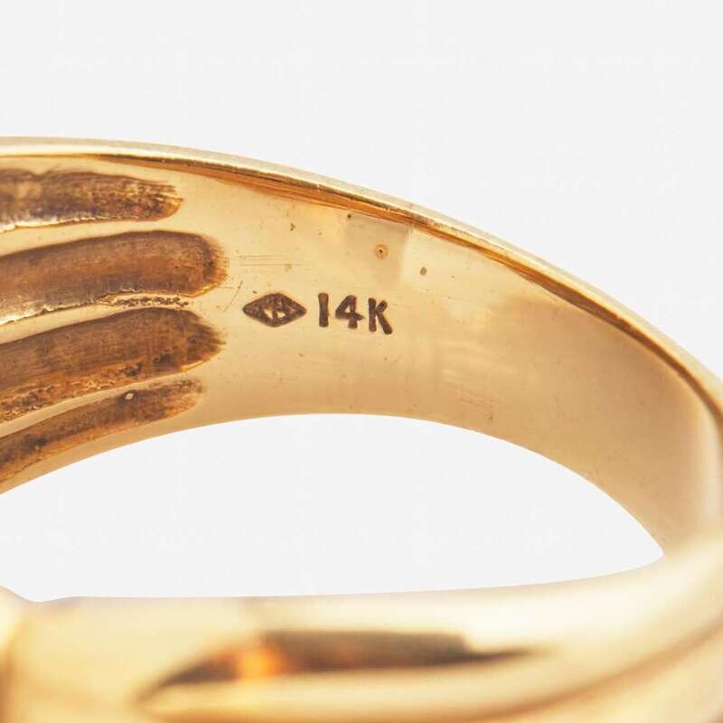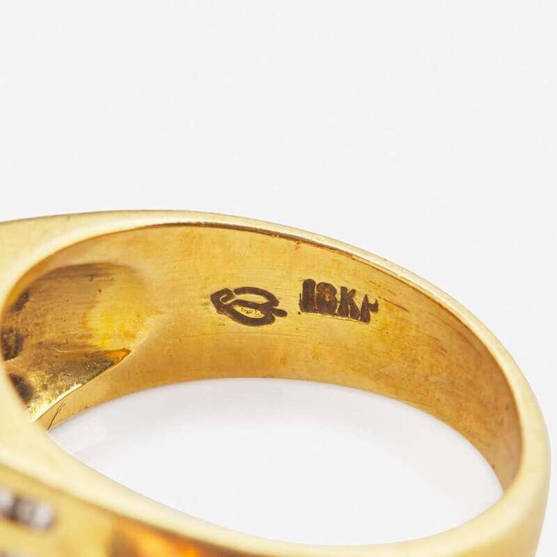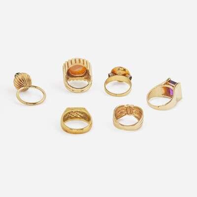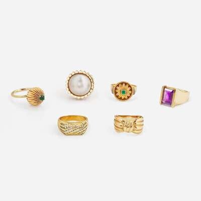 A collection of miscellaneous gold rings, including an 18K three-tone yellow, rose, and white gold ring set with a square-cut emerald, a 14K yellow gold ring set with a green glass stone, a 14K yellow gold ring featuring a mabé pearl, a 14K yellow gold ring set with a rectangular-cut spinel, a 14K yellow gold band, and an 18K yellow gold ring channel-set with round brilliant-cut diamonds. Diamonds are near colorless (G - J), with VS - SI clarity. Total estimated weight of diamonds: 0.50 carats.