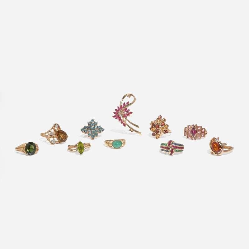 A miscellaneous collection of gem-set yellow gold jewelry, six 14K gold rings and three 10K rings set with various gemstones, and one 14K gold brooch set with pink topaz and round brilliant-cut diamonds.