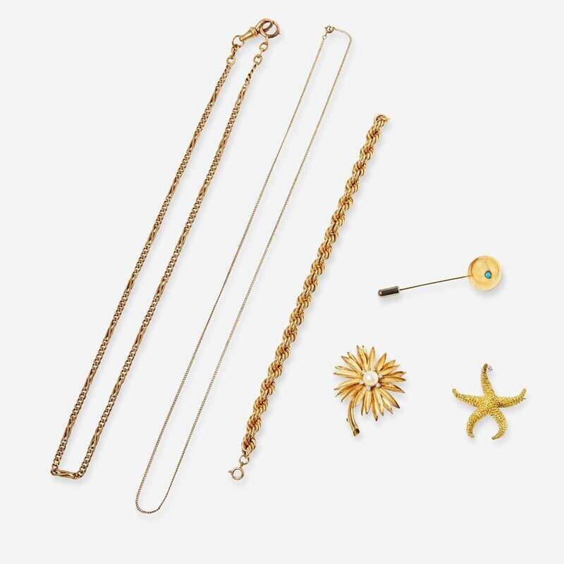 A miscellaneous collection of yellow gold jewelry, including two 10K yellow gold chains, a 10K yellow gold bracelet, a 14K yellow gold stick pin set with a blue cabochon stone, an 18K yellow gold brooch designed as a textured starfish set with one round brilliant-cut diamond, and a 14K yellow gold brooch designed as a flower, centering a round cultured pearl measuring approximately 6.93mm and accented by six round-cut diamonds. Total estimated weight of diamonds: 0.29 carats.