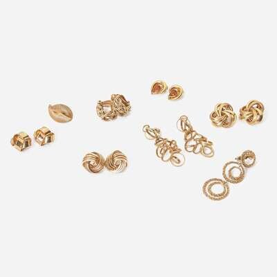A collection of yellow gold ear clips suitable for non-pierced ears, including two pairs of 14K knots, a pair of 14K half-hoops, half a pair of 14K ridged fans, a pair of 18K swirl buttons, a pair of 18K textured cascading circle drop earrings, half a pair of 18K textured concentric circle drops, and a pair of 18K earrings bezel-set with two pear-shaped citrine each measuring approximately 6.10mm x 8.38mm.