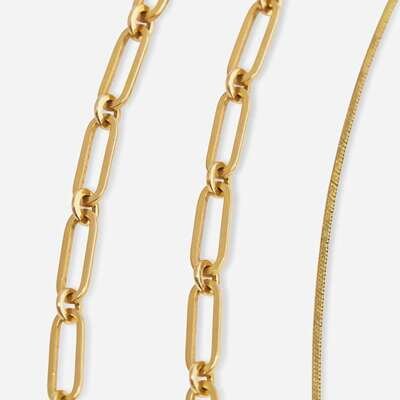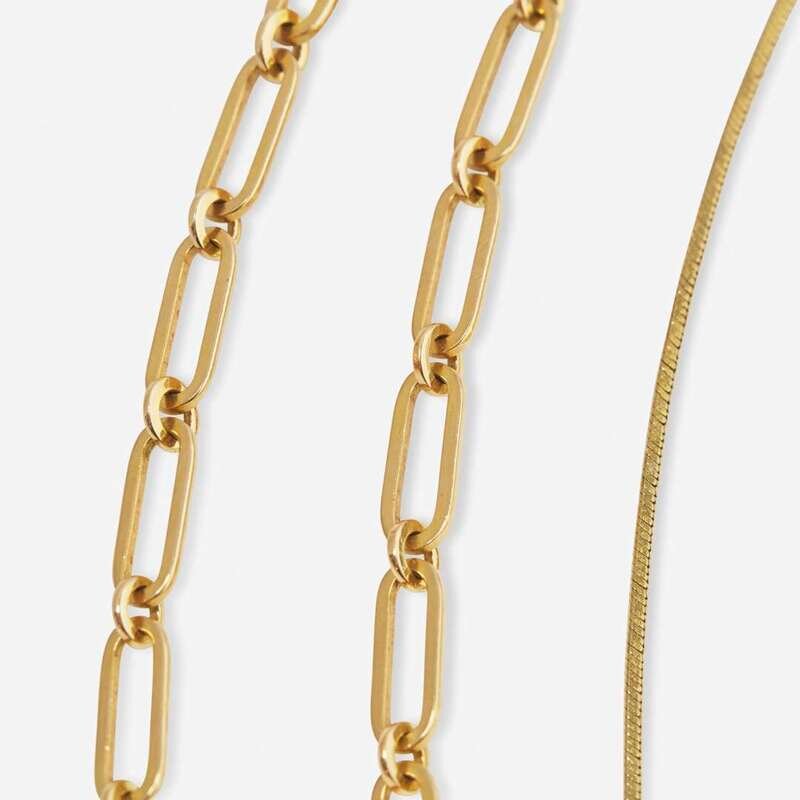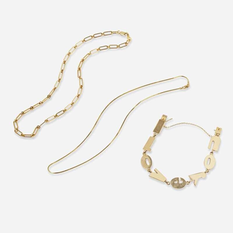 A collection of yellow gold jewelry, including a 14K yellow gold snake chain, a 14K yellow gold paperclip chain, and a 14K yellow gold bracelet that spells "LOVE YOU".