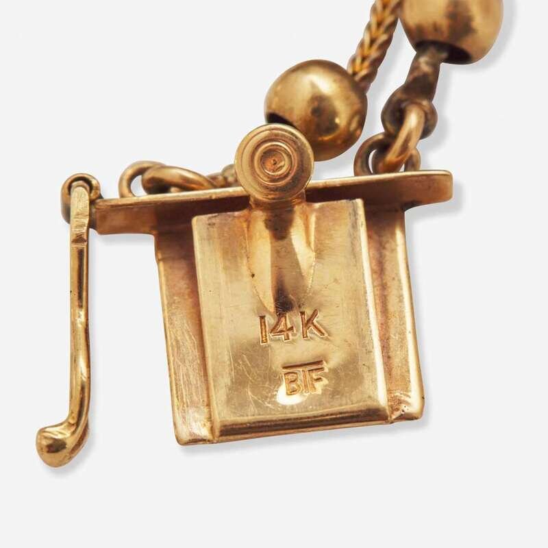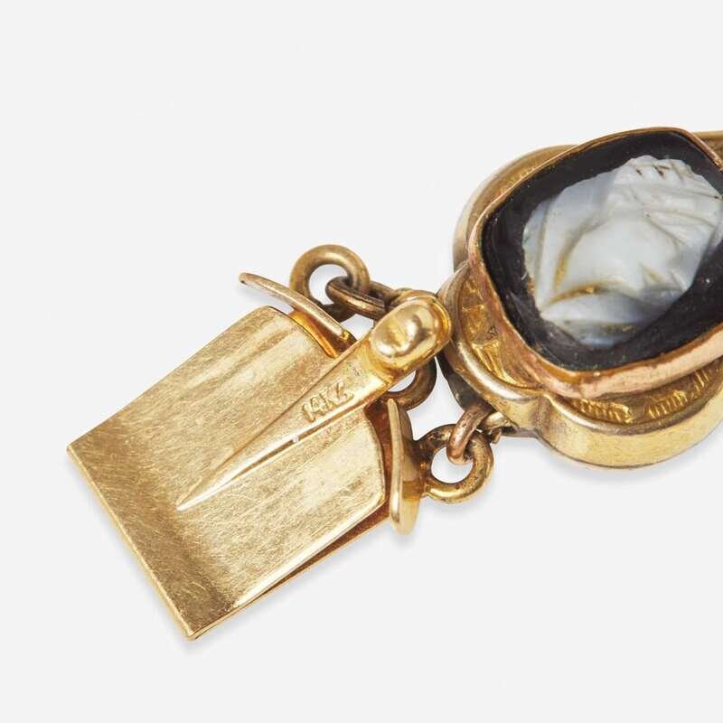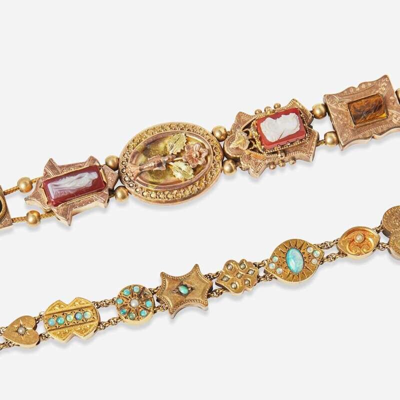 A set of two 14K yellow gold charm bracelets, one with a mix of gold and gold-filled cameo-themed charms, the other with a mix of gold and gold-filled charms variously set with opals, seed pearls, turquoise, and glass stones.