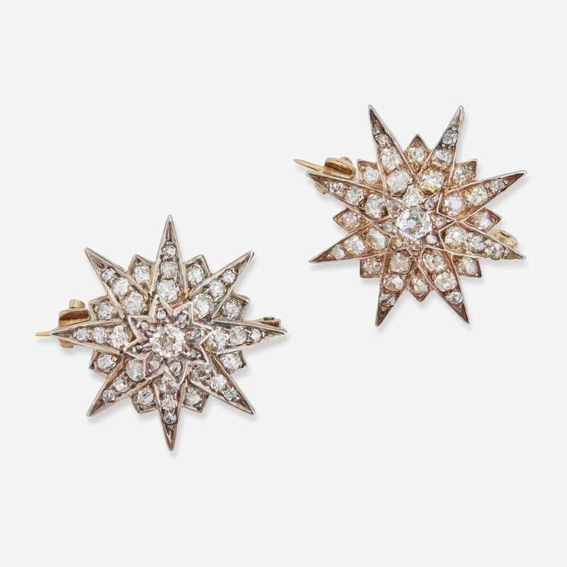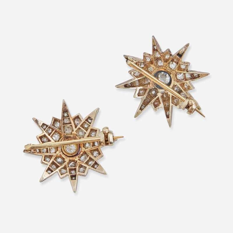 A pair of matching 10K yellow gold brooches, also functioning as pendants, designed as stars set with rose-cut and old European-cut diamonds. Diamonds are near colorless (G - J), with SI - I clarity. Total estimated weight of diamonds: 1.40 carats.