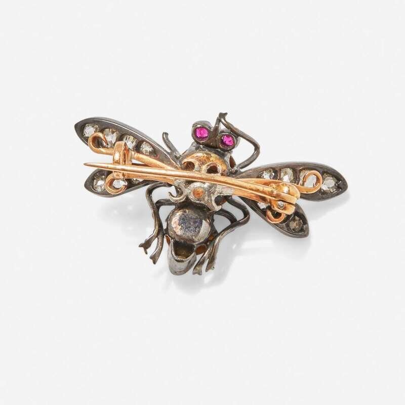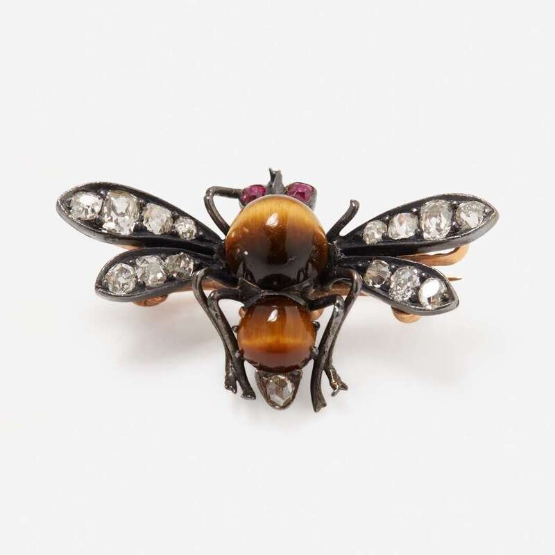 A 14K blackened gold, silver, and rose gold pin designed as a bee, set with two round tiger's eye cabochons as its body, two round-cut rubies for eyes, and wings and tail set with mine-cut diamonds. Diamonds are near colorless (G - J), with SI - I clarity. Total estimated weight of diamonds: 0.40 carats.