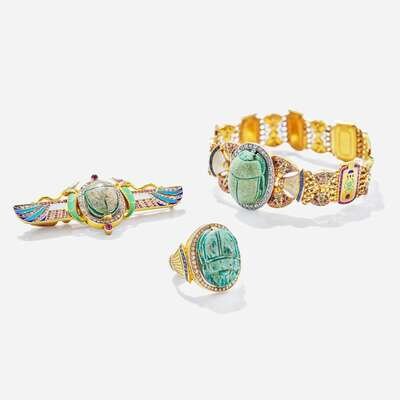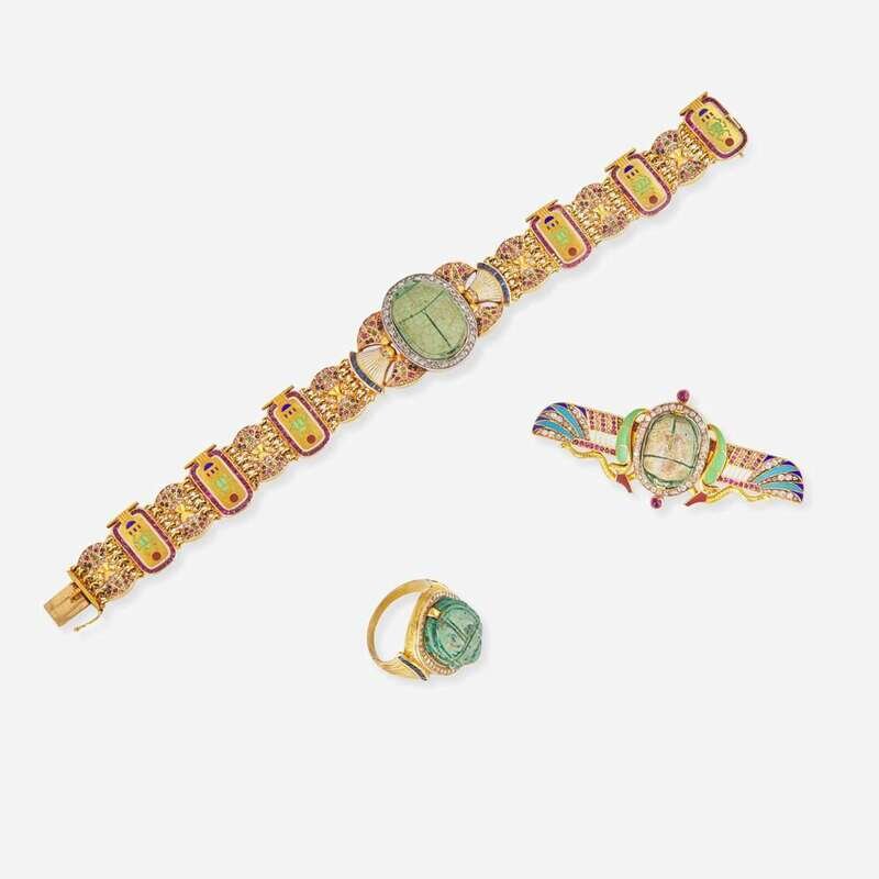 A three-piece Egyptian Revival jewelry set, including a 14K yellow gold ring featuring a carved turquoise scarab surrounded by a halo of round-cut rubies with calibre-cut sapphires decorating the textured shank, a 14K yellow gold brooch featuring a carved turquoise scarab surrounded by a halo of round-cut diamonds and accented by two round cabochon rubies, flanked by two green and pink enamel snakes, with enameled wings set with round-cut rubies and diamonds, and a 14K yellow gold bracelet centering a carved turquoise scarab surrounded by a halo of round-cut diamonds, with a series of enameled cartouches leading down the bracelet strap, accented by round-cut diamonds and emeralds, and round-cut and calibre-cut sapphires and rubies. Total estimated weight of diamonds: 1.78 carats.
