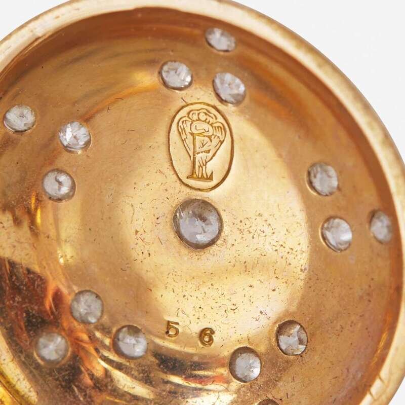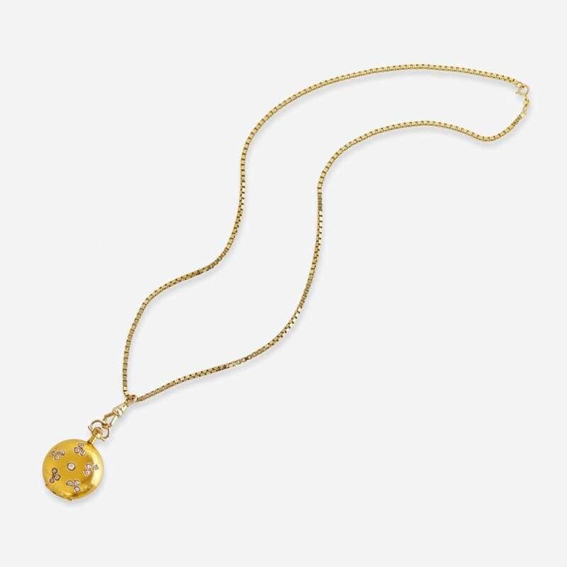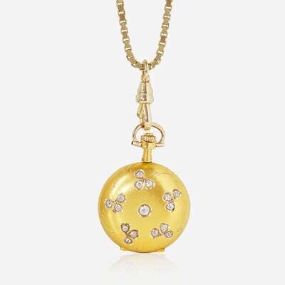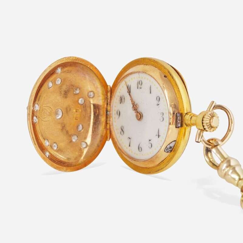 A 14K yellow gold pocket watch, featuring a white dial with black Arabic numerals at hour intervals, gold dots at minute intervals, and rose gold hour and minute hands, on a 14K yellow gold chain. The front cover of the watch is set with old European-cut diamonds that form the petals of flowers whose stems are delicately engraved into the gold cover. Diamonds are near colorless (G - J), with SI - I clarity. Total estimated weight of diamonds: 0.75 carats.