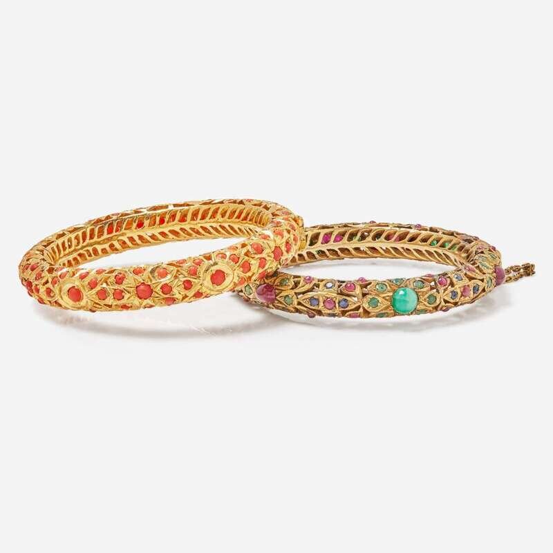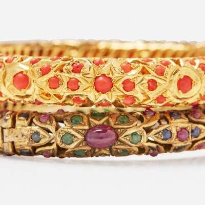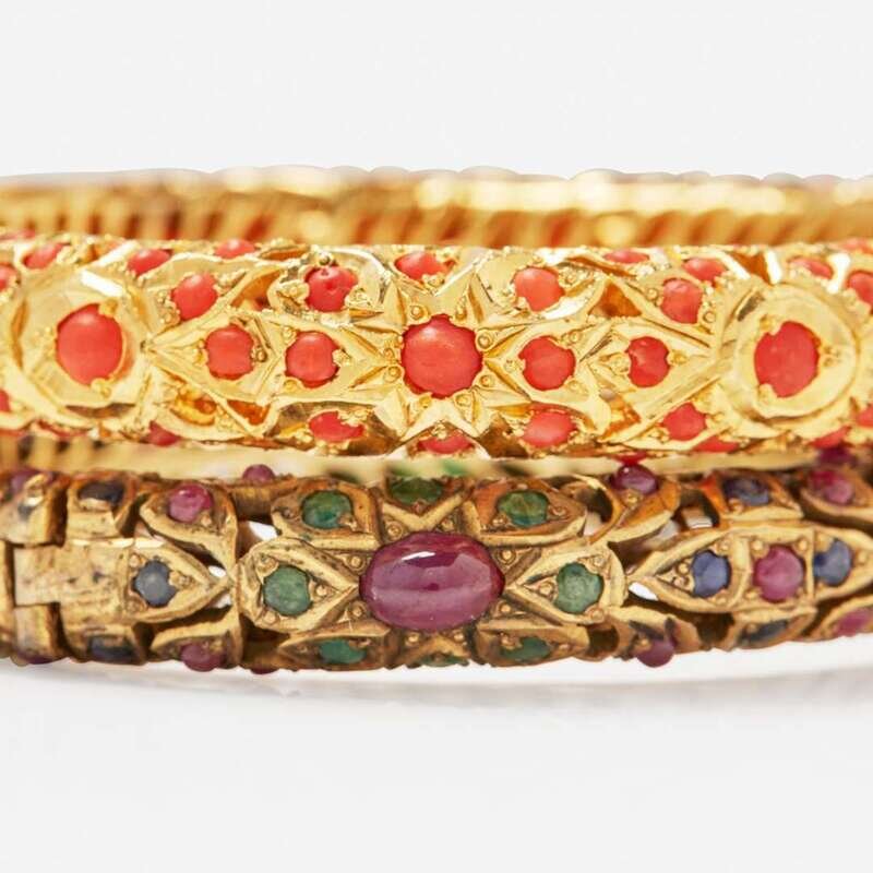 A set of two matching 10K yellow gold bangle bracelets, one set throughout with variously shaped coral, the other set throughout with variously shaped emeralds, rubies, and sapphires.