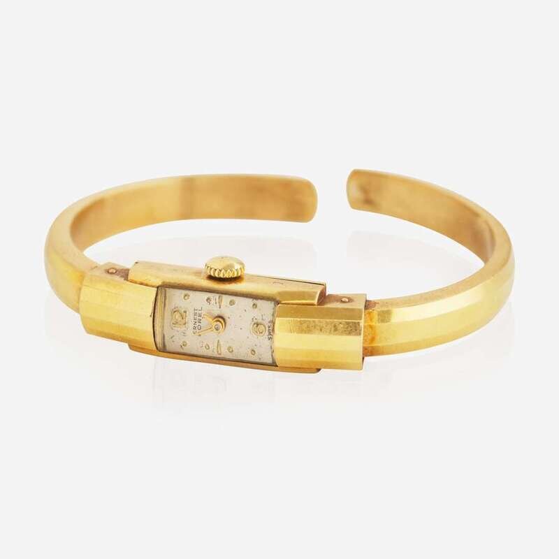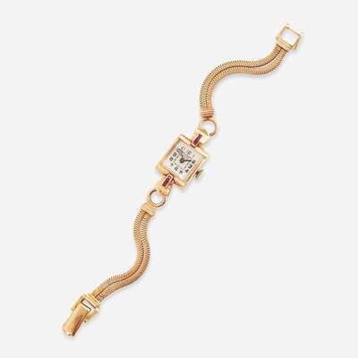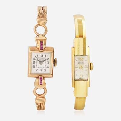 Two ladies gold watches, including an 18K yellow gold manual wind watch by Ernest Sorel featuring a white rectangular dial with gold hour and minute hands, Arabic numerals at 12 o'clock and 6 o'clock hours, and yellow gold circle markers at remaining hour intervals, on a ridged 18K yellow gold bangle bracelet, and a 14K rose gold manual wind watch by Jules Jurgensen featuring a white square dial with Arabic numerals at hour intervals, with six square-cut rubies set in the case, on a flexible 14K rose gold bracelet.