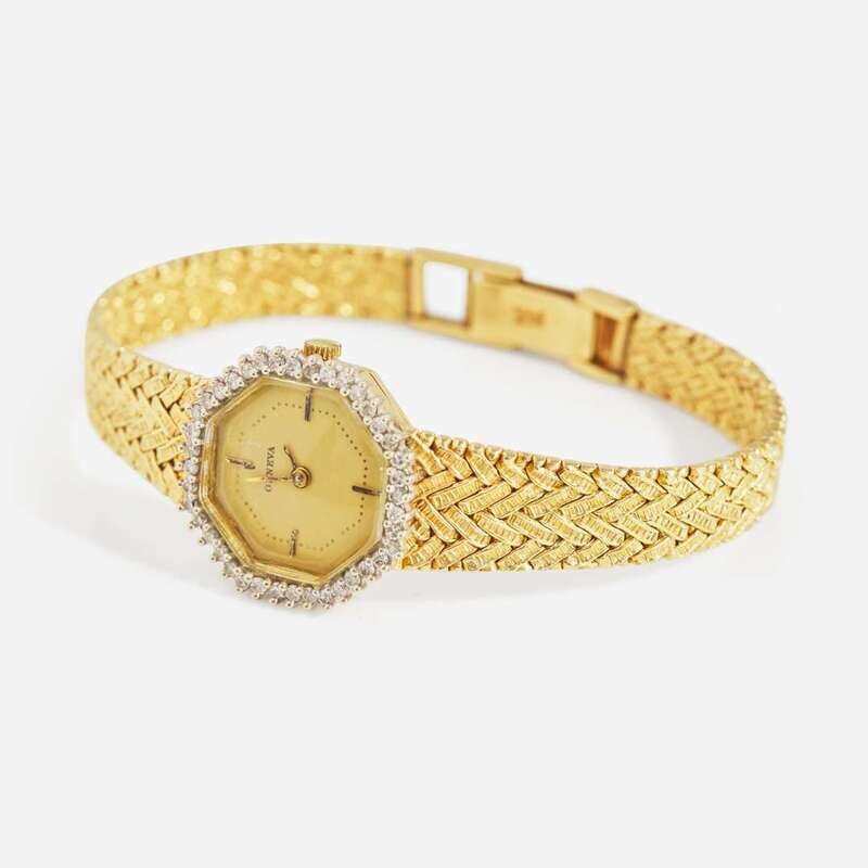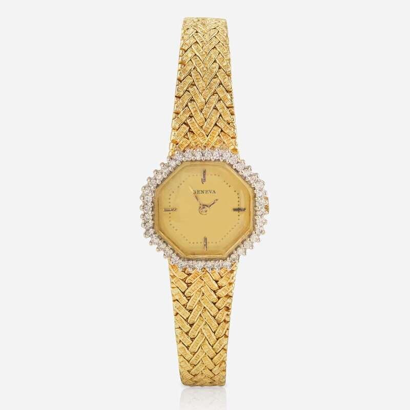 A 14K yellow gold battery operated ladies watch by Geneva, featuring an octagonal champagne dial with stick markers at 12 o'clock, 3 o'clock, 6 o'clock, and 9 o'clock, and gold stick hands for hours and minutes. The bezel is set with forty round brilliant-cut diamonds, is on a textured 14K yellow gold bracelet. Diamonds are near colorless (G - J), with VS - SI clarity. Total estimated weight of diamonds: 0.20 carats.