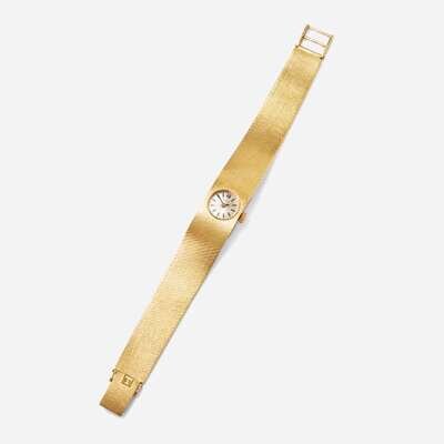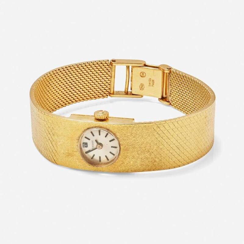 A ladies manual wind 18K yellow gold watch by Tissot, featuring a round white dial with black stick markers at hour intervals and black stick hands for hours and minutes, in a rectangular case with a fluted yellow gold crown, seamlessly incorporated into the 18K yellow gold bracelet.