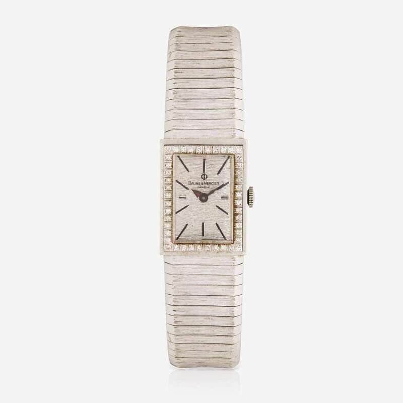 A 14K white gold ladies manual wind watch by Baume & Mercier, featuring a white gold rectangular dial with white gold hour and minute hands and black stick markers at hour intervals. The rectangular bezel is set with forty-four round-cut diamonds, near colorless (G - J), with VS - SI clarity. Total estimated weight of diamonds: 0.40 carats.