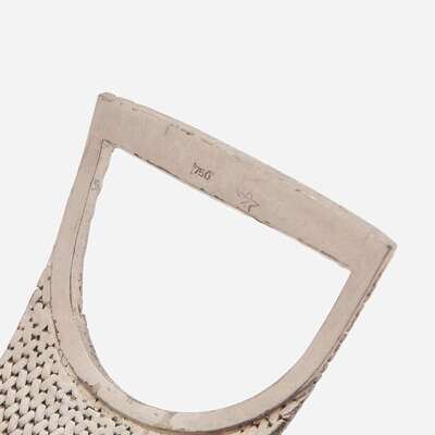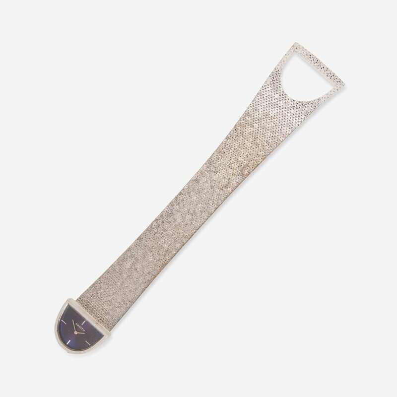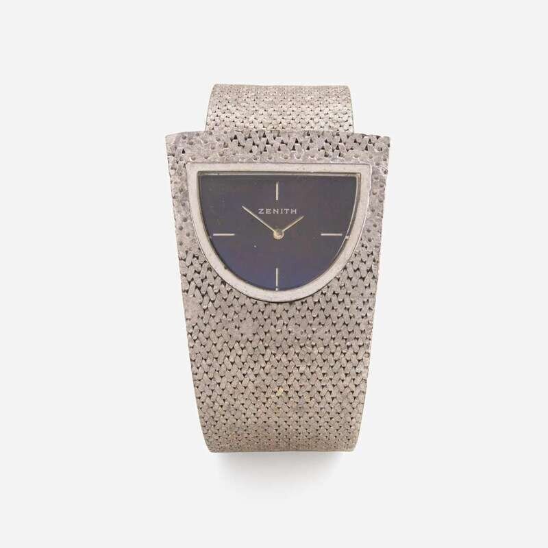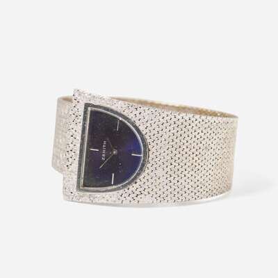 An 18K white gold manual wind ladies Zenith watch, featuring a dark blue semi-circular dial with white gold stick markers at 12 o'clock, 3 o'clock, 6 o'clock, and 9 o'clock, and white gold hour and minute hands. The 18K white gold bezel matches the modernist textured white gold bracelet, and the case fits in to an open catch for closure.