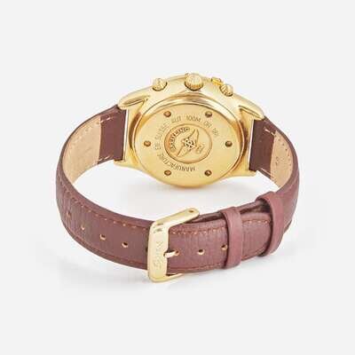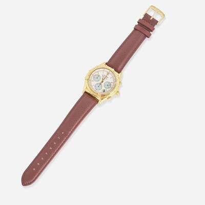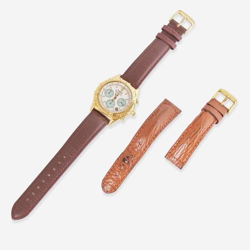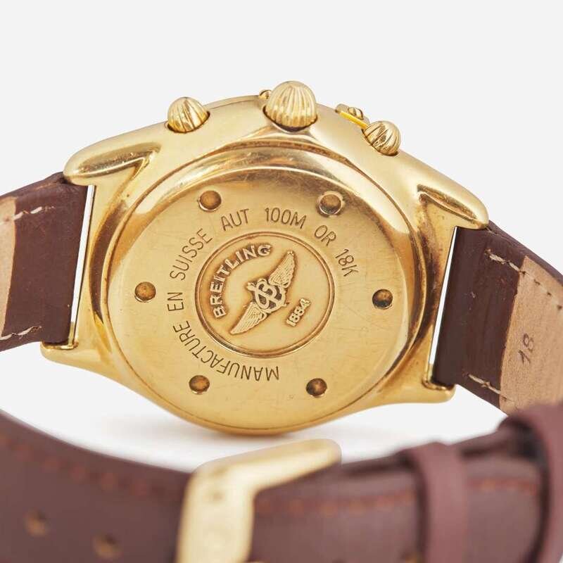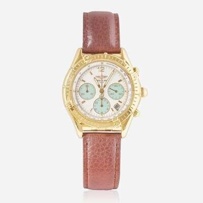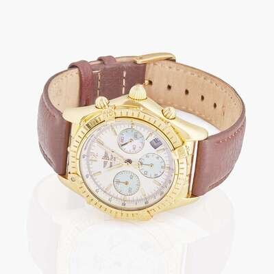 An 18K yellow gold Breitling Chronomat Cockpit K30012, featuring a white mother-of-pearl dial with applied faceted baton markers at hour intervals, and an applied gold Arabic marker at the 12 o'clock hour, under scratch resistant sapphire crystal. The gold baton hands have luminous inserts, as do the hour markers, and there are three complications with teal faces, including a running seconds indicator at 3 o'clock, a 12-hour chronograph totalizer at 9 o'clock, and a 30-minute register at 3 o'clock, along with a date aperture between 4 and 5 o'clock. The gold domed screw-down chronograph push buttons match the bezel, which is further engraved with 60-minute graduations and raised riders at quarter hours with Arabic numeral markers. The automatic self-winding movement is rhodium-plated, and constructed with 55 jewels, a shock absorber, and a straight-line escapement. The watch is on a Speidel anti-allergic water-resistant brown leather bracelet with a yellow metal buckle.