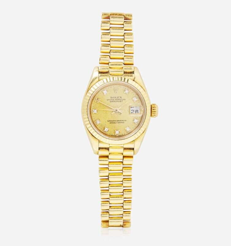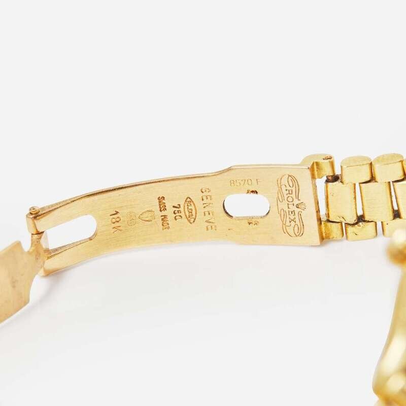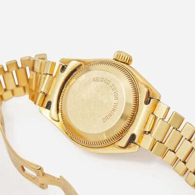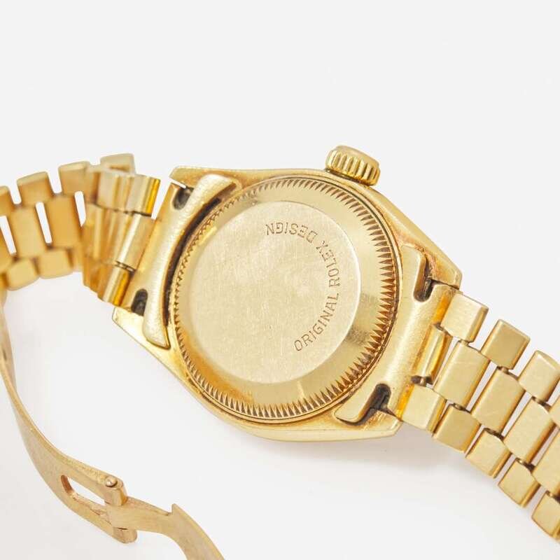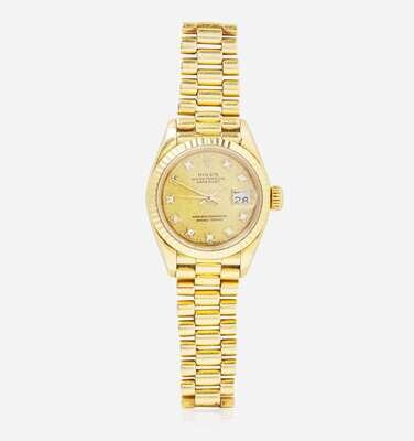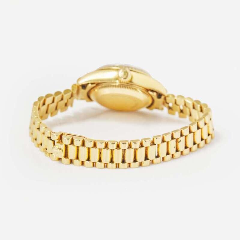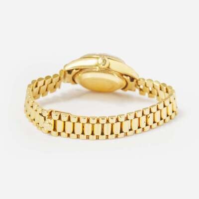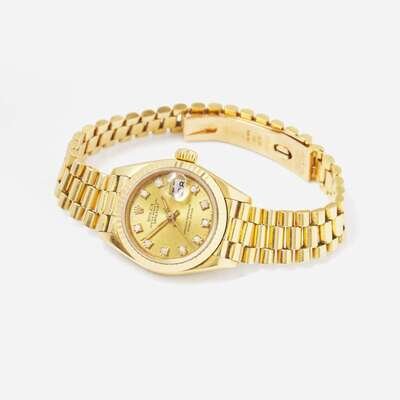 An 18K yellow gold ladies automatic movement Rolex Oyster Perpetual Datejust, with a champagne dial featuring diamond markers at hour intervals, yellow gold hands for hours, minutes, and seconds, a date aperture at 3 o'clock, and scratch-resistant synthetic sapphire crystal in an 18K yellow gold fixed fluted bezel with a screw-down crown. The watch has an 18K yellow gold President bracelet that finishes with a foldover clasp.