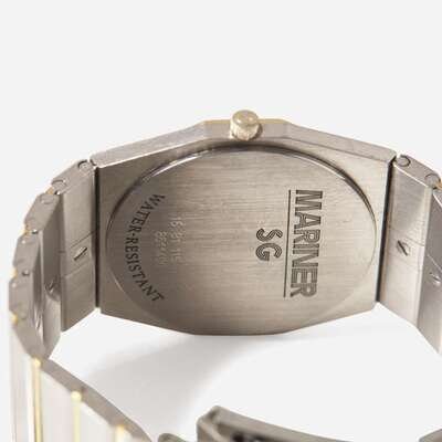 A collection of three watches, including a quartz battery operated stainless steel and yellow gold Concord Mariner SG on a steel and gold bracelet with a hidden fold clasp, a manual wind 18K yellow gold 17J watch by Mathey Tissot on a brown leather strap, and a stainless steel and 18K yellow gold Ebel automatic movement watch on a green leather bracelet with an adjustable stainless steel deployant clasp.