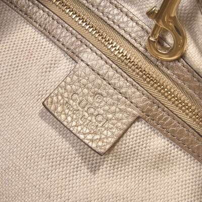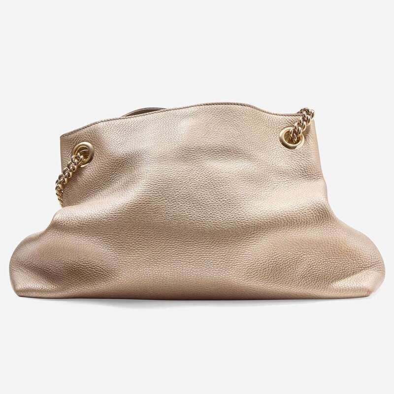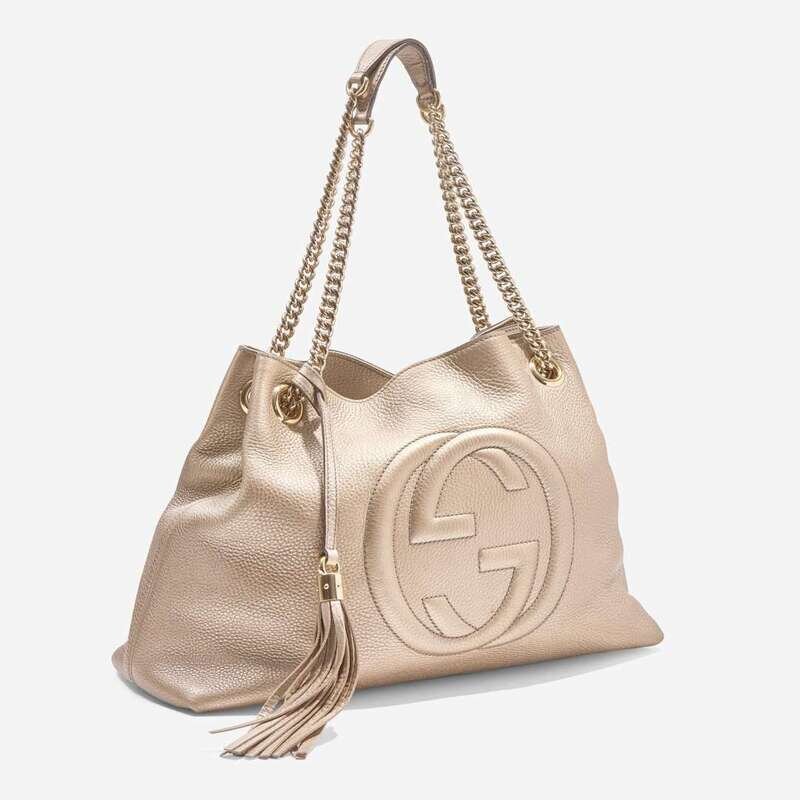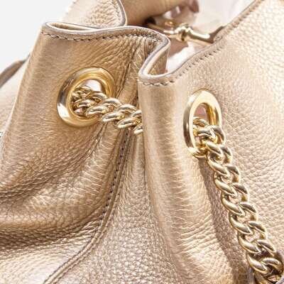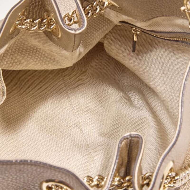 A Metallic Champagne pebbled calfskin Soho Chain shoulder bag by Gucci, featuring the iconic double "G" Gucci logo embroidered on the front, a yellow metal chain double strap with leather accents for added comfort, and yellow metal hardware accents. The bag opens at the top with a clip closure, revealing an interior lined with neutral textile, with two slip pockets on one side of the interior, and one zipped pocket on the other.