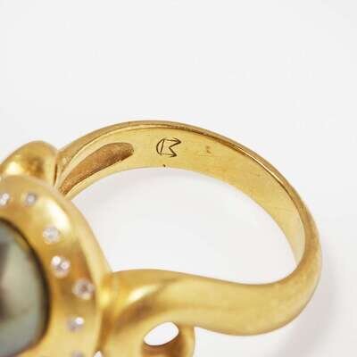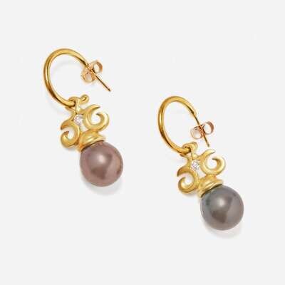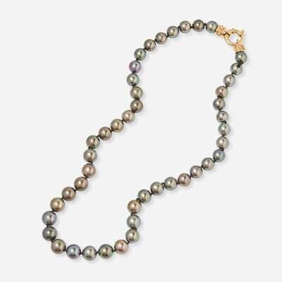 A collection of yellow gold and black pearl jewelry, including an 18K yellow gold ring set with a round black pearl measuring approximately 9.11mm accented by round brilliant-cut diamonds, a pair of 18K yellow gold earrings suitable for pierced ears set with two round black pearls each measuring approximately 10.77mm accented by two round brilliant-cut diamonds, and a strand of graduated black pearls measuring from approximately 9.02mm at the smallest to approximately 10.62mm at the largest with a 14K yellow gold clasp. Diamonds are near colorless (G - J), with VS - SI clarity. Total estimated weight of diamonds: 0.20 carats.