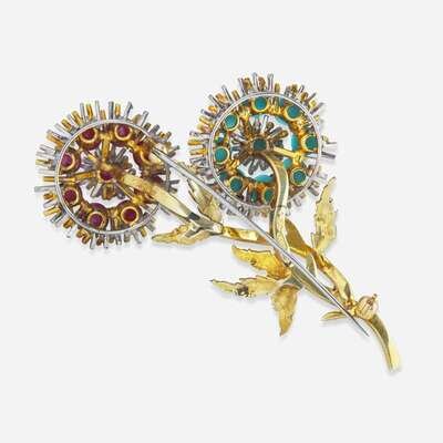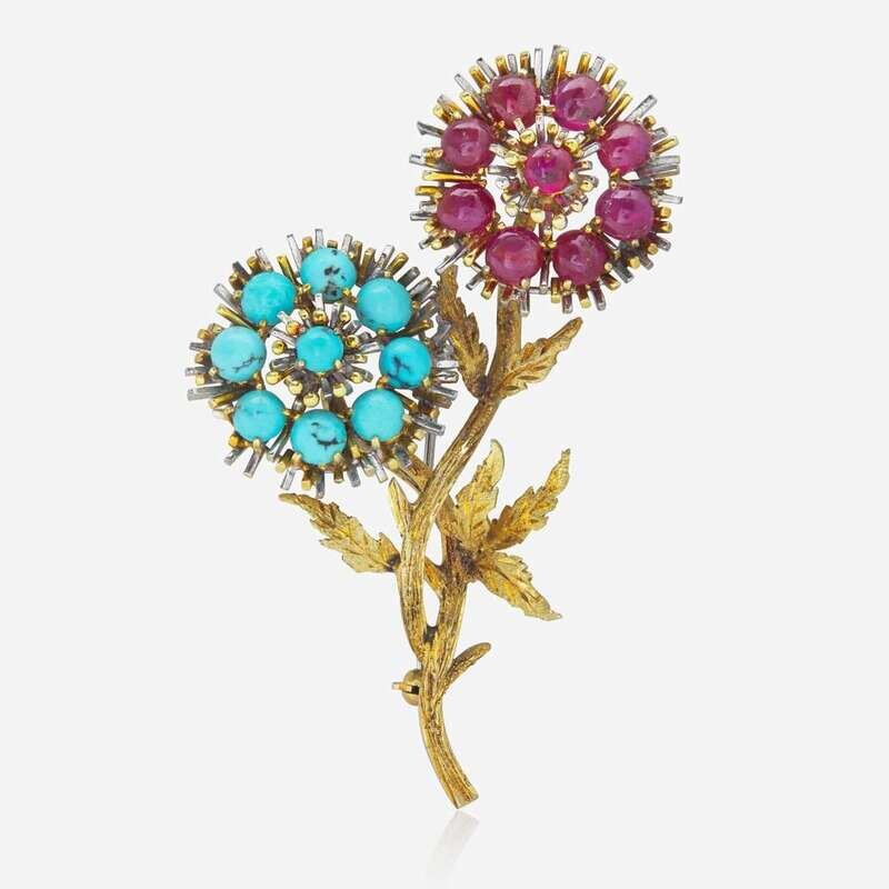 A two-tone 14K yellow and white gold brooch designed as a sprig of flowers, with one flower set with nine cabochon rubies each measuring from approximately 4.55mm at the smallest to approximately 4.97mm at the largest, and the other flower set with nine cabochon turquoise each measuring from approximately 4.21mm at the smallest to approximately 5.11mm.
