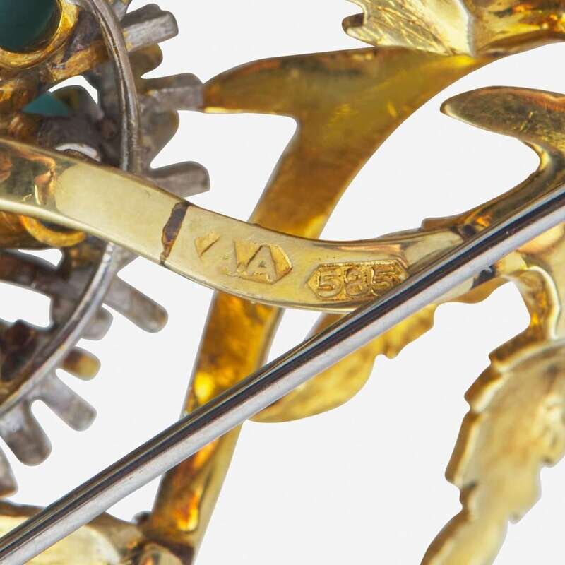 A Two-Tone 14K Gold, Ruby, and Turquoise Brooch