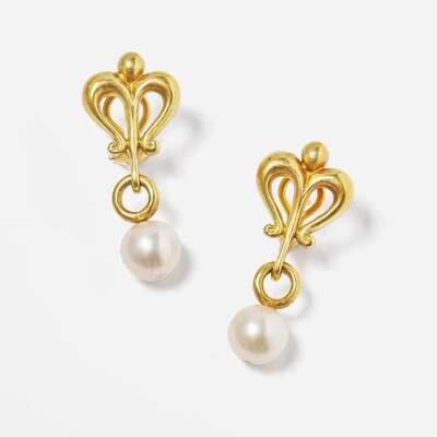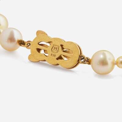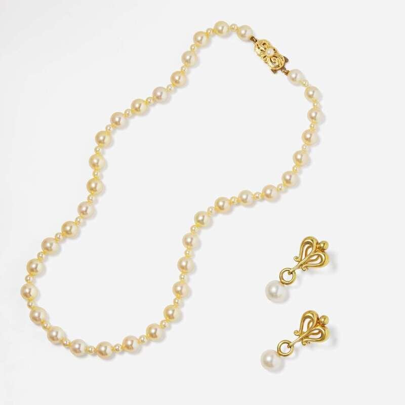 A Pair of 18K Yellow Gold and Pearl Earrings and a Mikimoto Pearl Necklace