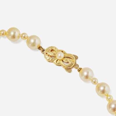A Mikimoto pearl strand strung with round cultured pearls of alternating sizes with an 18K yellow gold clasp, and a pair of 18K yellow gold earrings suitable for pierced ears on stud posts with omega clip backs, each dangling a round cultured pearl measuring approximately 9.15mm.