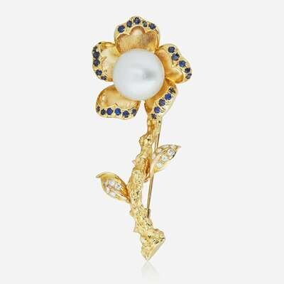 A 14K yellow gold brooch designed as a flower centering a round cultured pearl measuring approximately 14.60mm, with the petals accented by round-cut sapphires, and leaves on the stem accented with round brilliant-cut diamonds. Diamonds are near colorless (G - J), with VS - SI clarity. Total estimated weight of diamonds: 0.35 carats.