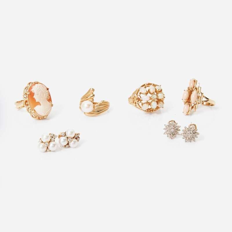 A miscellaneous collection of gem-set jewelry, including a 10K yellow gold ring set with opals, a 14K yellow gold ring with a cameo depicting a woman in profile, a 14K yellow gold ring set with smooth almond-shape segments of coral, a 14K yellow gold ring set with a round cultured pearl, a pair of 14K yellow gold earrings set with pearls and round brilliant-cut diamonds, and a pair of 14K yellow gold earrings designed as starbursts set with round brilliant-cut diamonds. Diamonds are near colorless (G - J), with SI - I clarity. Total estimated weight of diamonds: 1.48 carats.