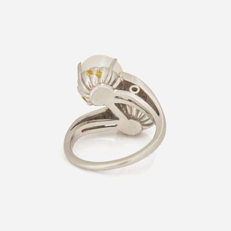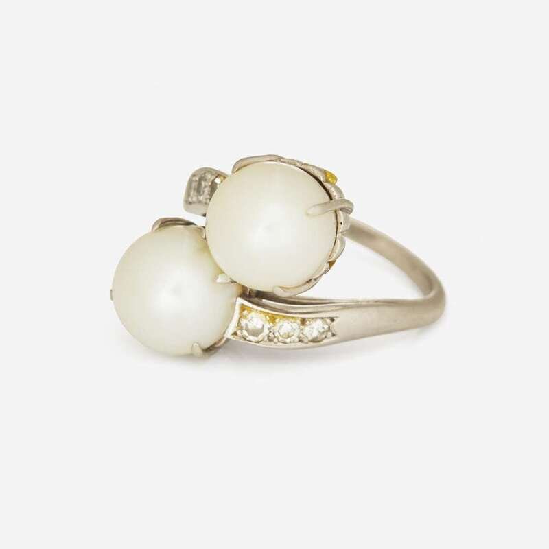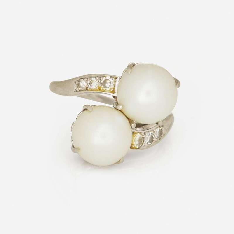 A platinum ladies ring featuring two cultured pearls measuring approximately 9.10mm and 9.20mm respectively, accented by six round brilliant-cut diamonds leading down the asymmetrical shank. Diamonds are near colorless (G - J), with SI - I clarity. Total estimated weight of diamonds: 0.18 carats.