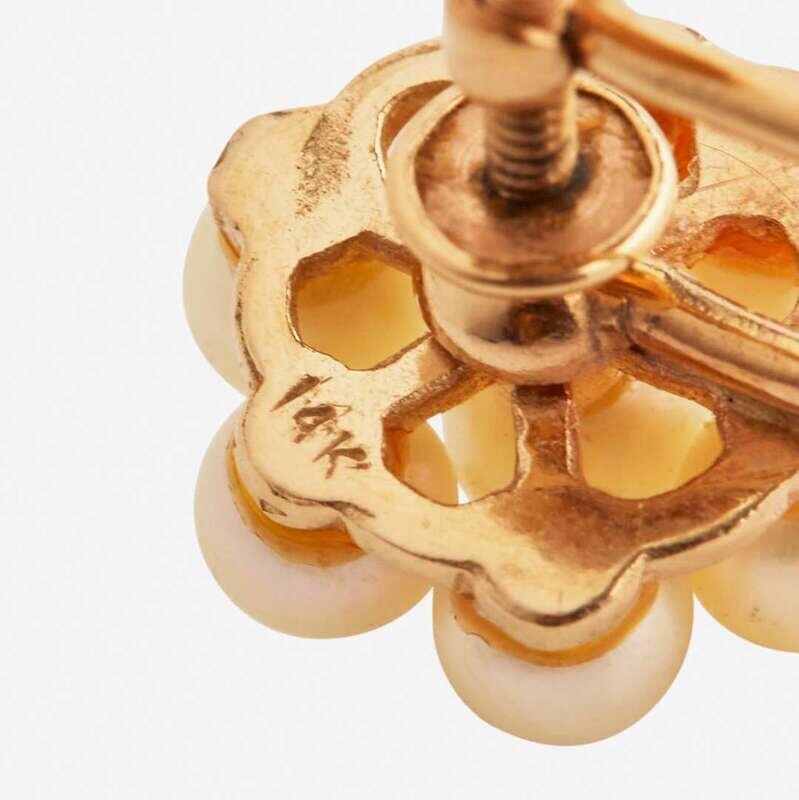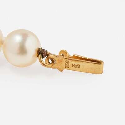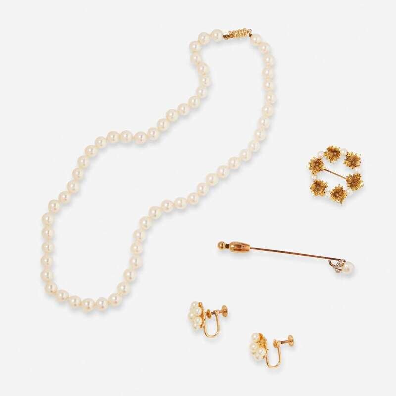 A group of pearl jewelry, including a strand of pearls each measuring approximately 6.40mm with an 18K yellow gold clasp, a 14K yellow gold brooch also functioning as a pendant, designed as a wreath of leaves accented by six round white pearls each measuring approximately 3.60mm, a pair of earrings suitable for non-pierced ears set with round white pearls measuring from approximately 4.35mm at the smallest to approximately 4.72mm at the largest, and a 14K yellow gold stick pin set with a baroque pearl measuring approximately 5.79mm and four rose-cut diamonds.