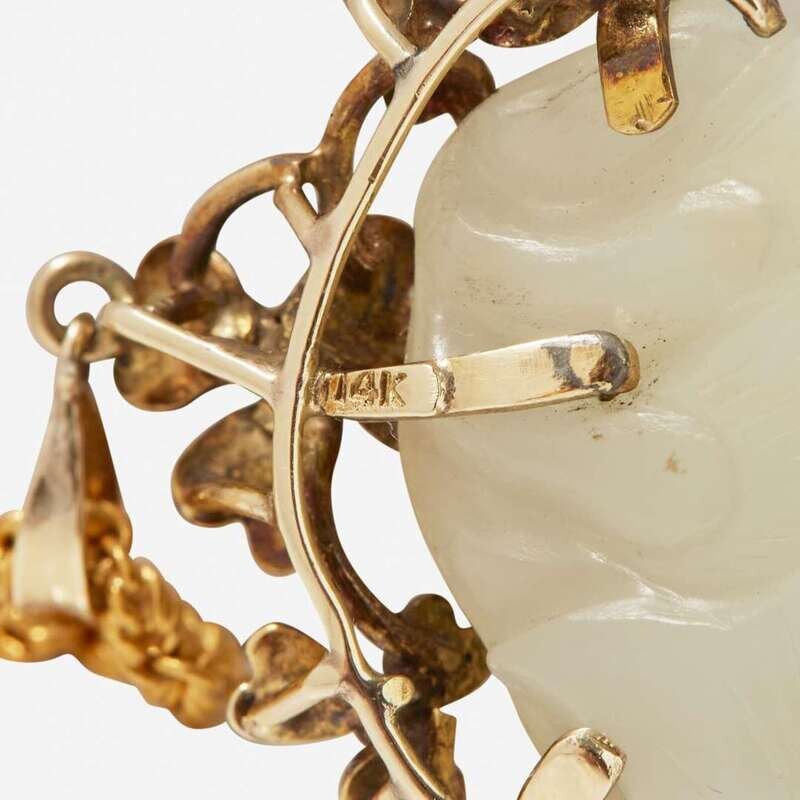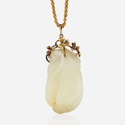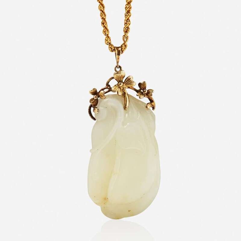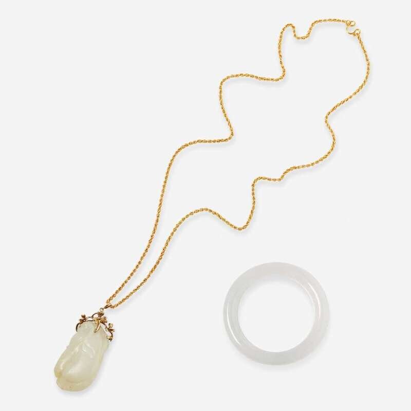 A set of jade jewelry, including a jade bangle bracelet and a carved jade and 14K yellow gold pendant on a 22K yellow gold chain.