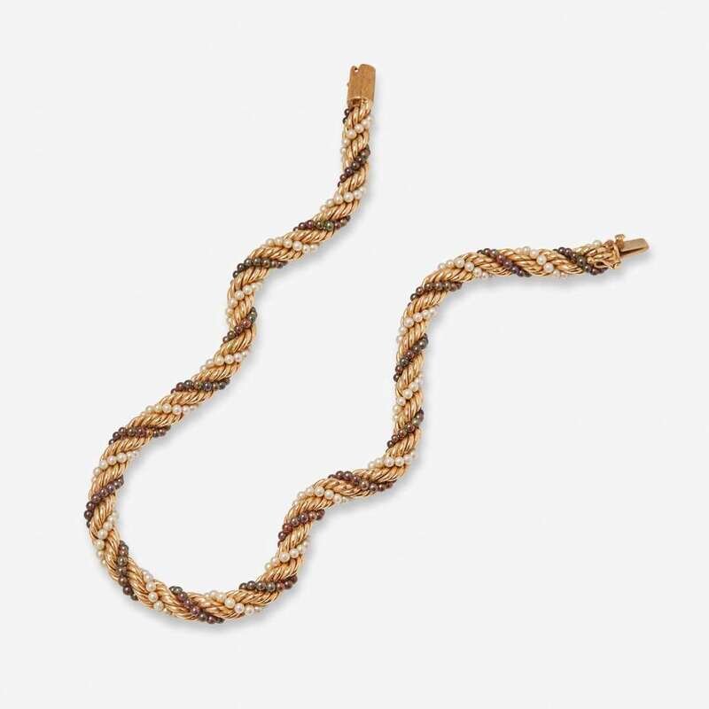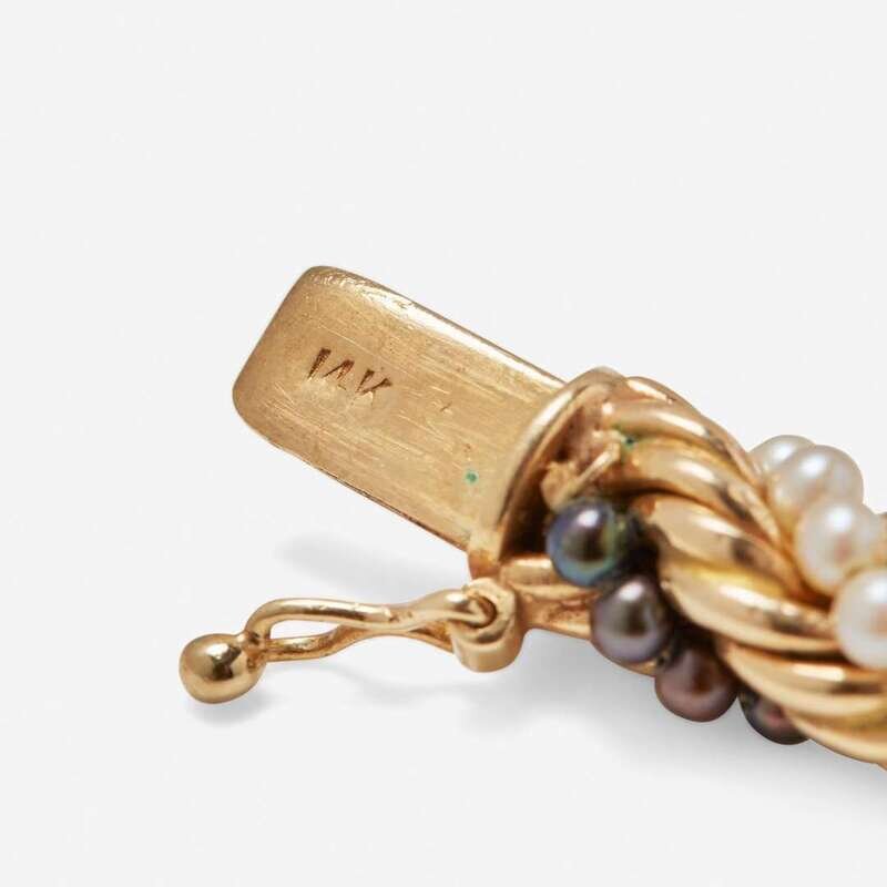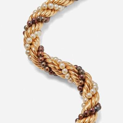 A 14K yellow gold necklace designed as twisting strands of yellow gold intertwined with two running strands of black and white seed pearls, each pearl measuring approximately 2.75mm.