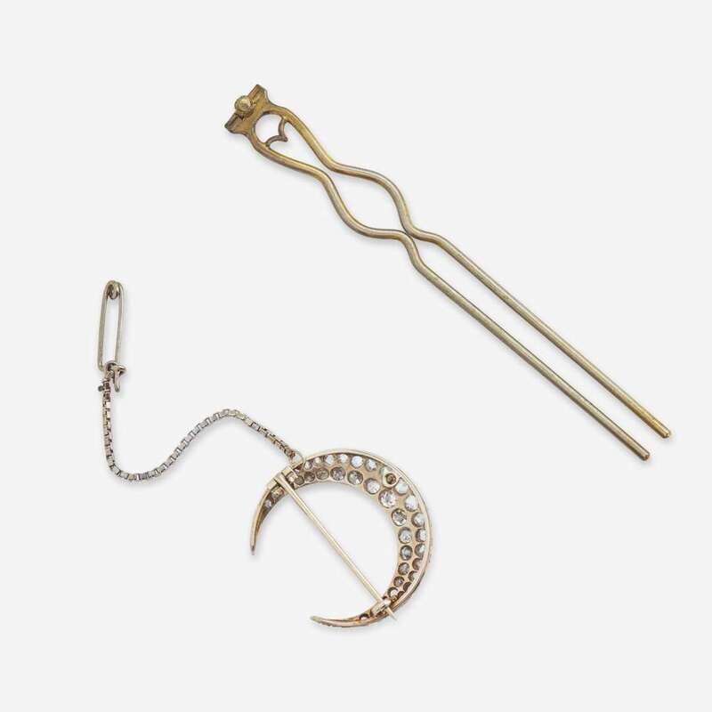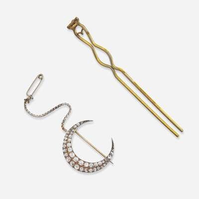 A yellow gold hair pin with a removable accessory also functioning as a brooch, designed as a crescent moon set with rose-cut and old European-cut diamonds in silver-topped settings. Diamonds are near colorless (G - J), with SI - I clarity. Total estimated weight of diamonds: 0.93 carats.