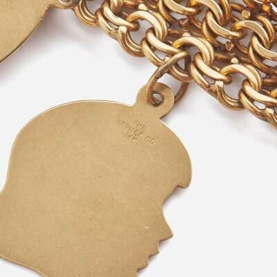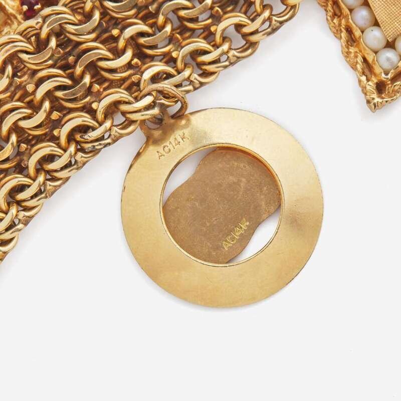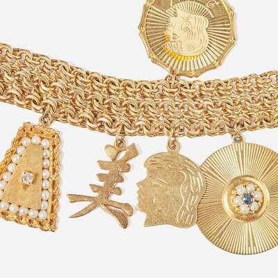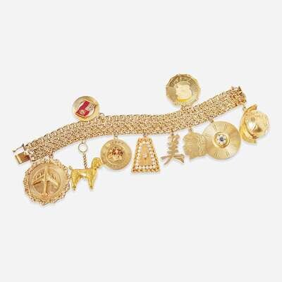 A 14K yellow gold wide mesh bracelet with charms, including a 14K yellow gold globe that spins, a textured 14K yellow gold medallion set with a sapphire and seed pearls, two 14K yellow gold charms featuring a girl's profile, a 14K yellow gold character charm, a 14K yellow gold charm set with seed pearls and a clear spinel, a 14K yellow gold "Happy Birthday" charm set with glass stones, a 14K yellow gold flag charm, an 18K poodle charm, and a 14K airplane medallion charm.
