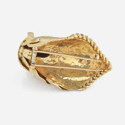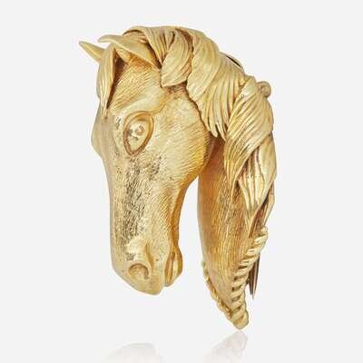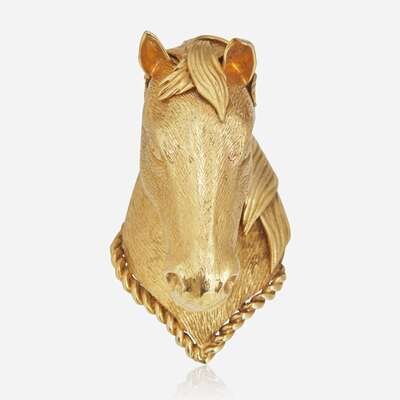 An 18K yellow gold pendant also functioning as a brooch, designed as a horse's head on a double-needle pin with a retractable bail.