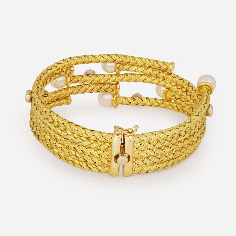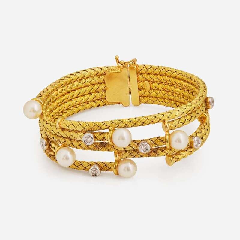 An 18K yellow gold bracelet, designed as strands of woven rope chain joined together in a freeform style by round white pearls each measuring approximately 7.00mm, and round brilliant-cut diamonds in white gold bezel settings. Diamonds are near colorless (G - J), with VS - SI clarity. Total estimated weight of diamonds: 0.30 carats.
