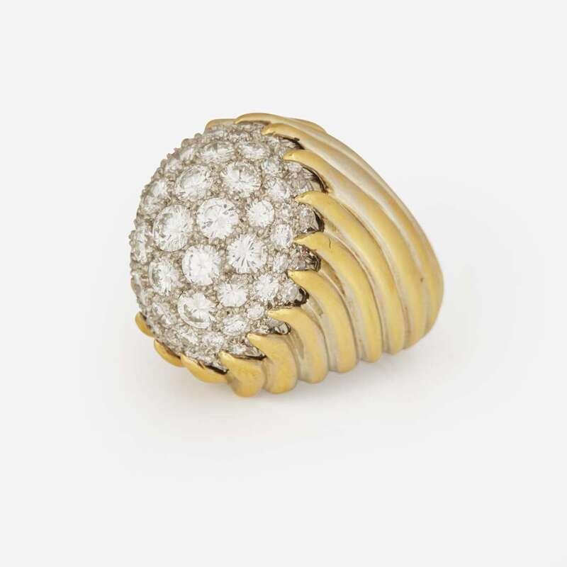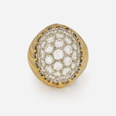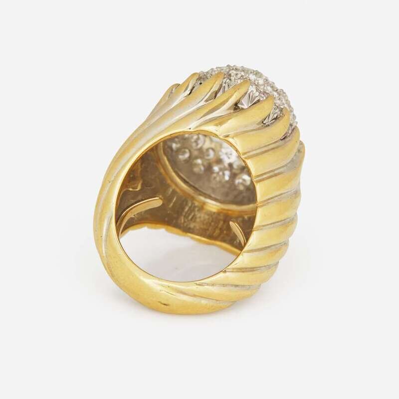 An 18K yellow gold cocktail ring designed as a large dome covered in round brilliant-cut and single-cut diamond, on a wide swirling yellow gold shank. Diamonds are near colorless (G - J), with VS - I clarity. Total estimated weight of diamonds: 6.50 carats.