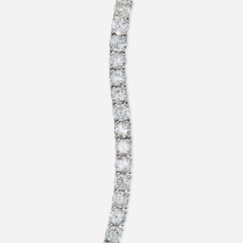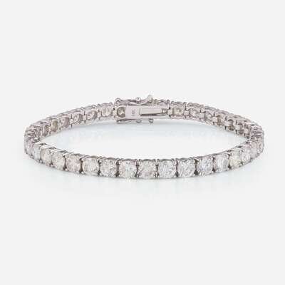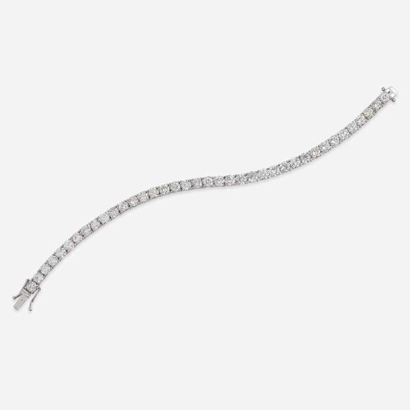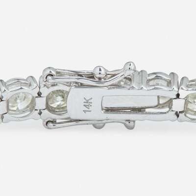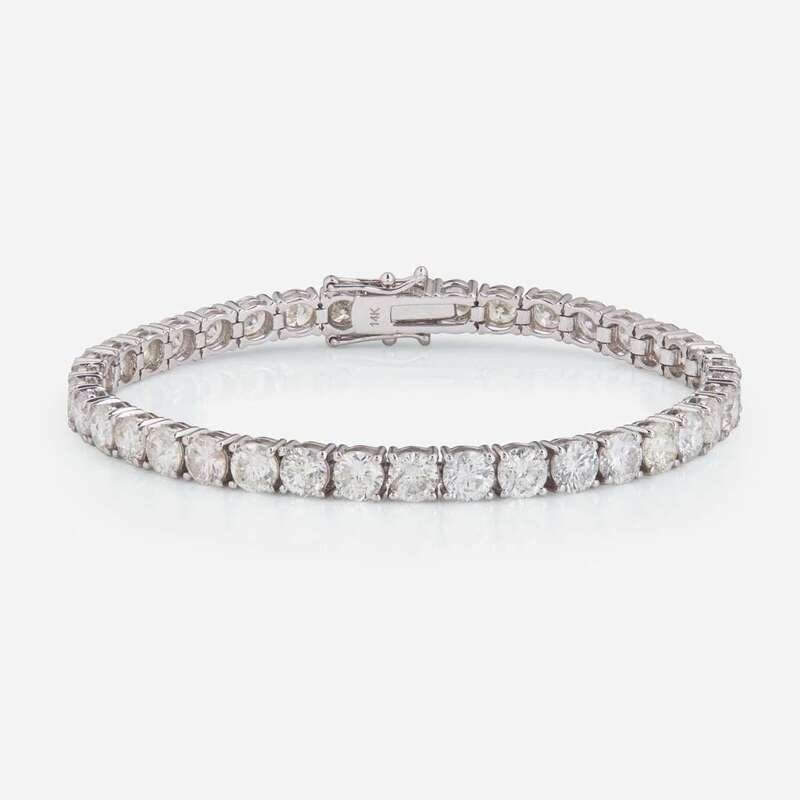 A 14K white gold line bracelet, set with thirty-eight round brilliant-cut diamonds with faint color (K - M), and I clarity. Total estimated weight of diamonds: 13.55 carats.