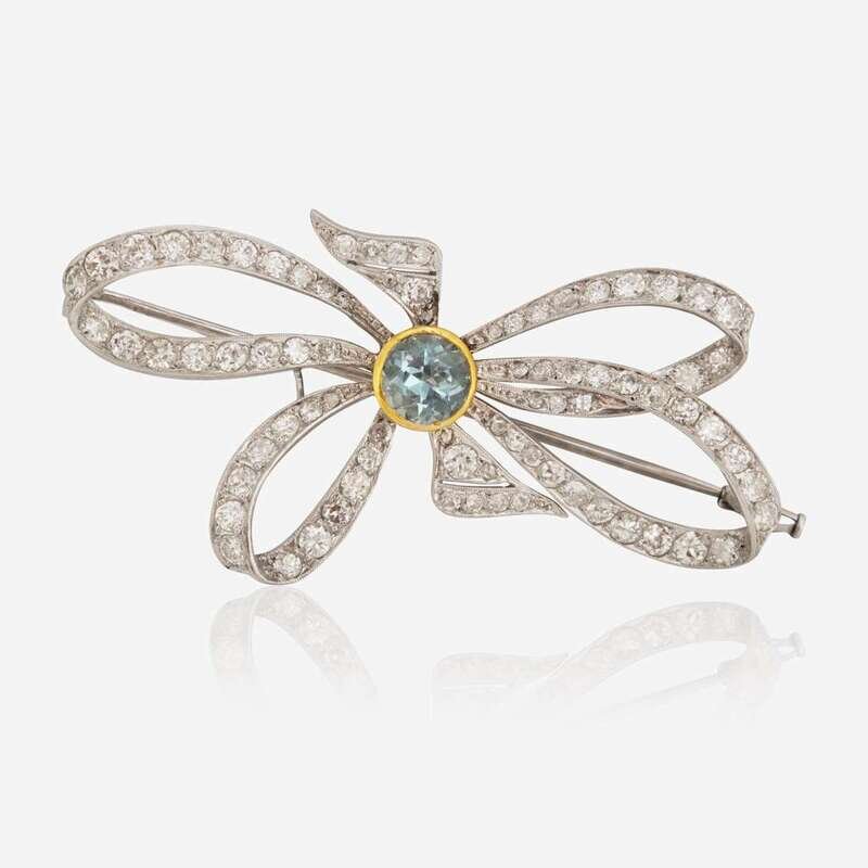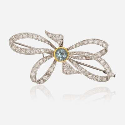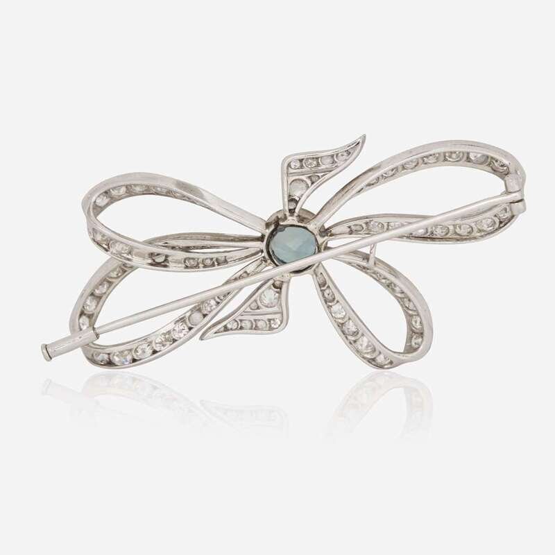 A platinum brooch designed as a bow, set throughout with round brilliant-cut diamonds, and centering a round-cut blue zircon measuring approximately 6.97mm bezel-set in yellow gold. Diamonds are near colorless (G - L), with SI - I clarity. Total estimated weight of diamonds: 3.30 carats.