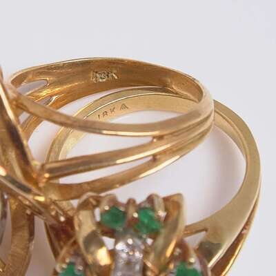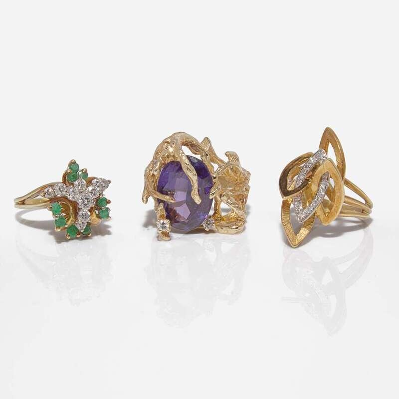 A collection of three yellow gold ladies rings, including a 14K yellow gold ring organically designed ring featuring branch segments centering an oval-cut purple synthetic sapphire measuring approximately 13.25mm x 18.23mm, approximately 14.00 carats, accented by three round brilliant-cut diamonds, an 18K yellow gold ring designed as a cluster of round-cut emeralds and round brilliant-cut diamonds, and an 18K yellow gold ring designed as interlocking almond-shaped gold yellow gold segments, centering one white gold segment set with diamonds. Diamonds are near colorless (G - J), with VS - I clarity. Total estimated weight of diamonds: 1.13 carats.