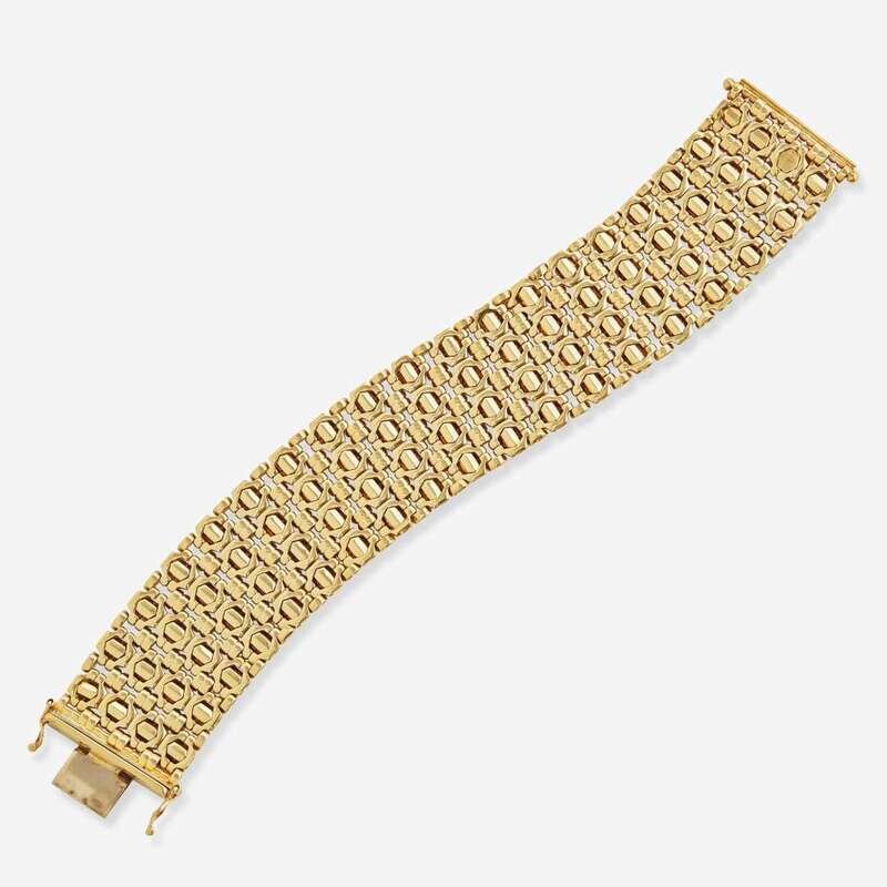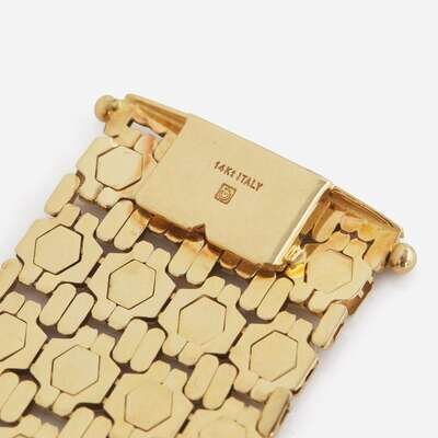 A 14K Italian yellow gold wide panel bracelet, with a box clasp and two figure-eight safety latches.