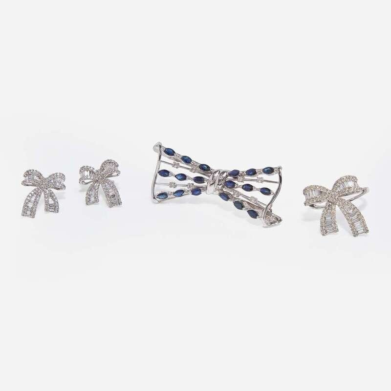 A collection of 14K white gold bow jewelry, including a ring set with baguette-cut and round brilliant-cut diamonds, a pair of stud earrings set with baguette-cut and round brilliant-cut diamonds, and a pin set with round brilliant-cut diamonds and eighteen marquise-cut sapphires each measuring approximately 2.50mm x 4.15mm. Diamonds are near colorless to faint color (G - L), with VS - I clarity. Total estimated weight of diamonds: 3.34 carats.