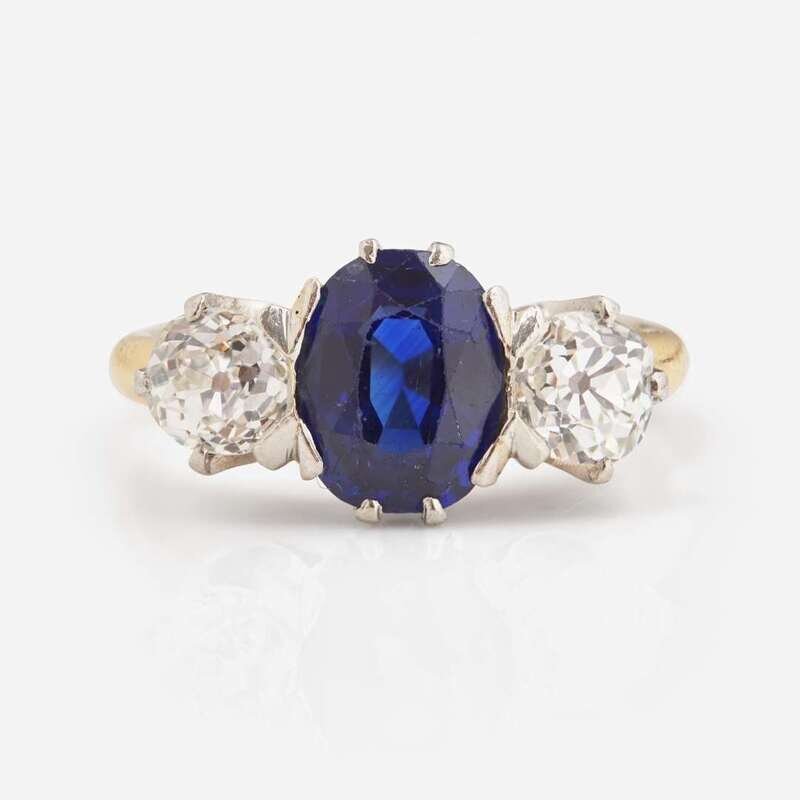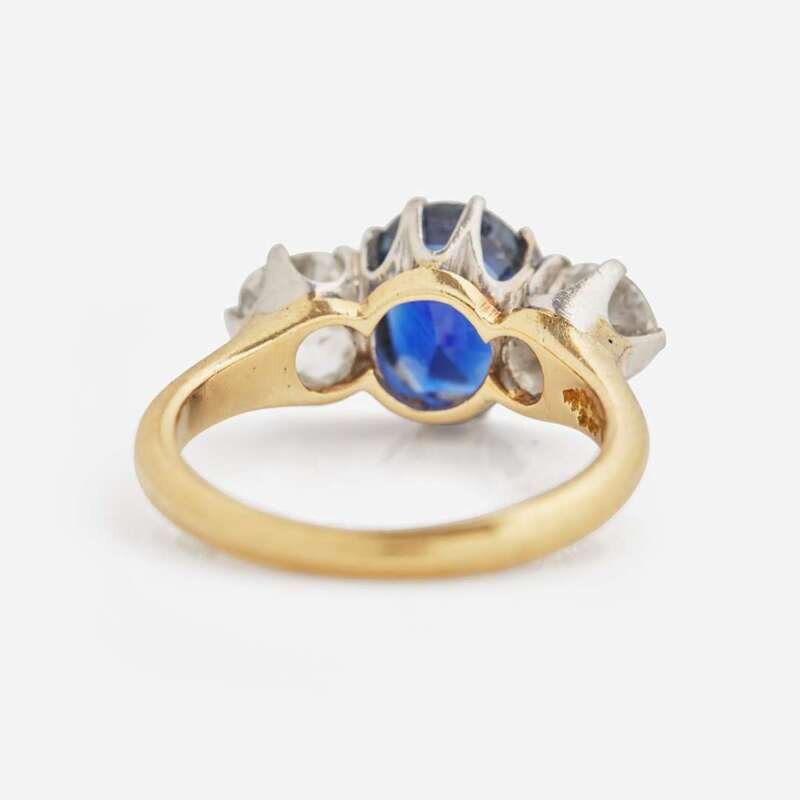 An 18K yellow gold ring by Tiffany & Co. centering an oval-cut sapphire measuring approximately 6.00mm x 7.93mm, mounted on a platinum setting, flanked by two old European-cut diamonds, near colorless (G - J), with VS - SI clarity. Total estimated weight of diamonds: 0.72 carats.