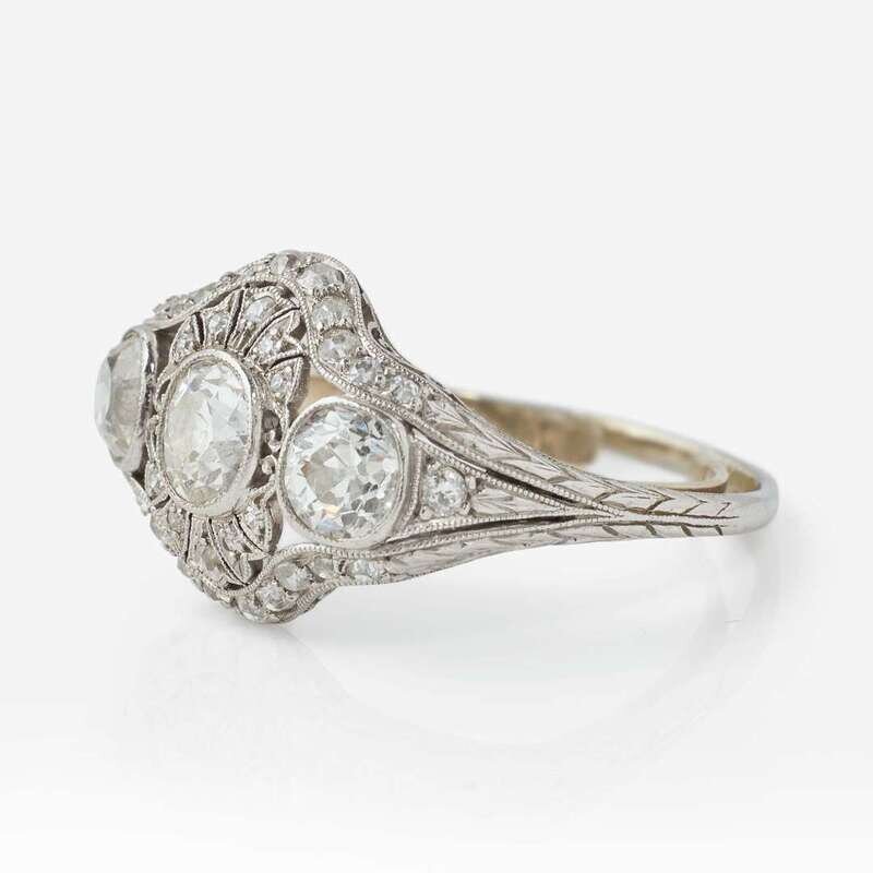 A Belle Epoque ladies platinum three-stone diamond ring featuring three old mine-cut diamonds, accented by further old European-cut diamonds decorating the openwork setting. Diamonds are near colorless to faint color (H - K), with SI clarity. Total estimated weight of diamonds: 2.20 carats.